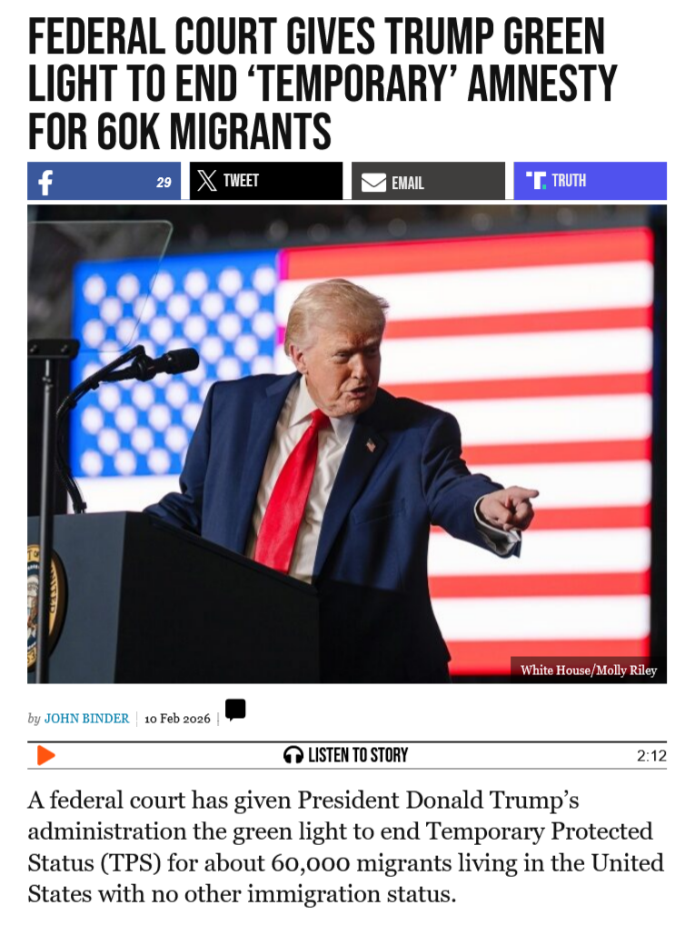 oh no, magasisters, what are we going to dohttps://www.breitbart.com/politics/2026/02/10/federal-court-gives-trump-green-light-to-end-temporary-amnesty-for-60k-migrants/>This week, the United States Court of Appeals for the Ninth Circuit granted a stay of a lower court’s order that blocked Trump from ending TPS for migrants from Honduras, Nicaragua, and Nepal.it's joever. we can't let him get his hands on the nuclear codes. i am now a cruz missile.