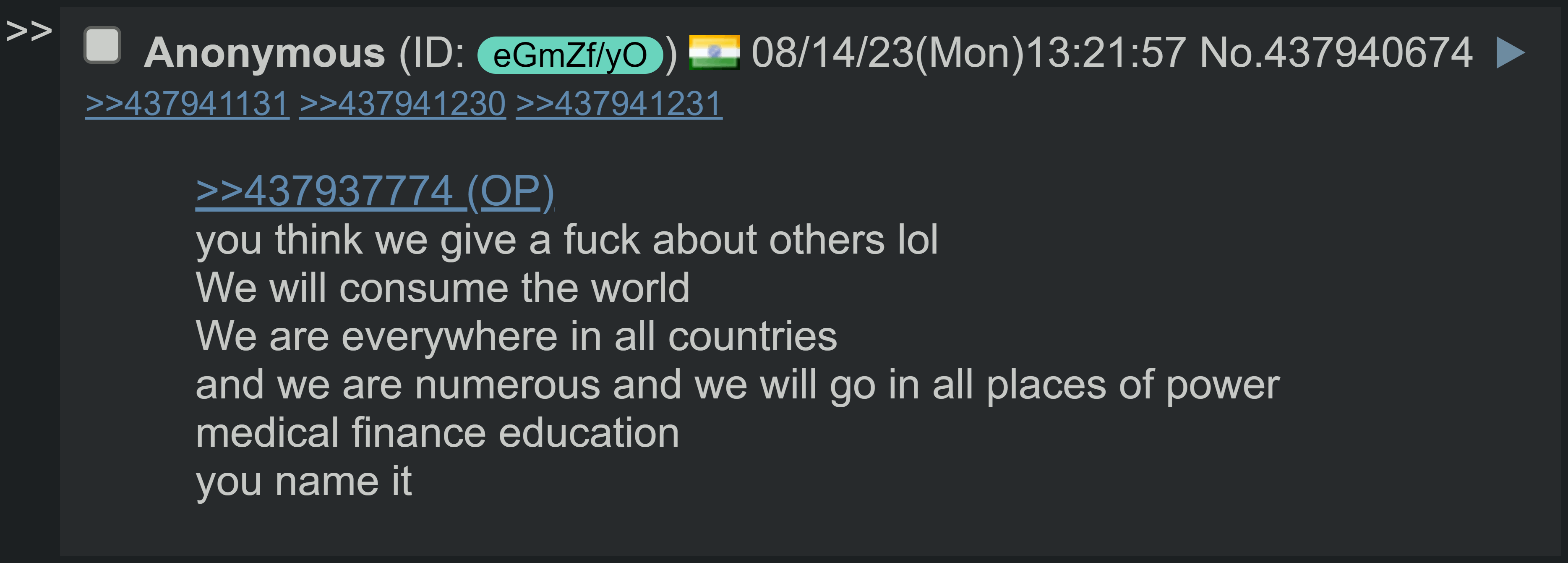 >>528223182>>528223231meanvile u all hating on Indiaaa, India is better dan yor hole cuntry put togetherrr! Ve hav daa oldesst religion in vorld, ve respect cow like goddess! Ve living more openly dan u ppl, full freedom, no tension. And our cuntry even reach MOON, meanwhile u people only doing OnlyFans and crying on 4chan section! Jealous?