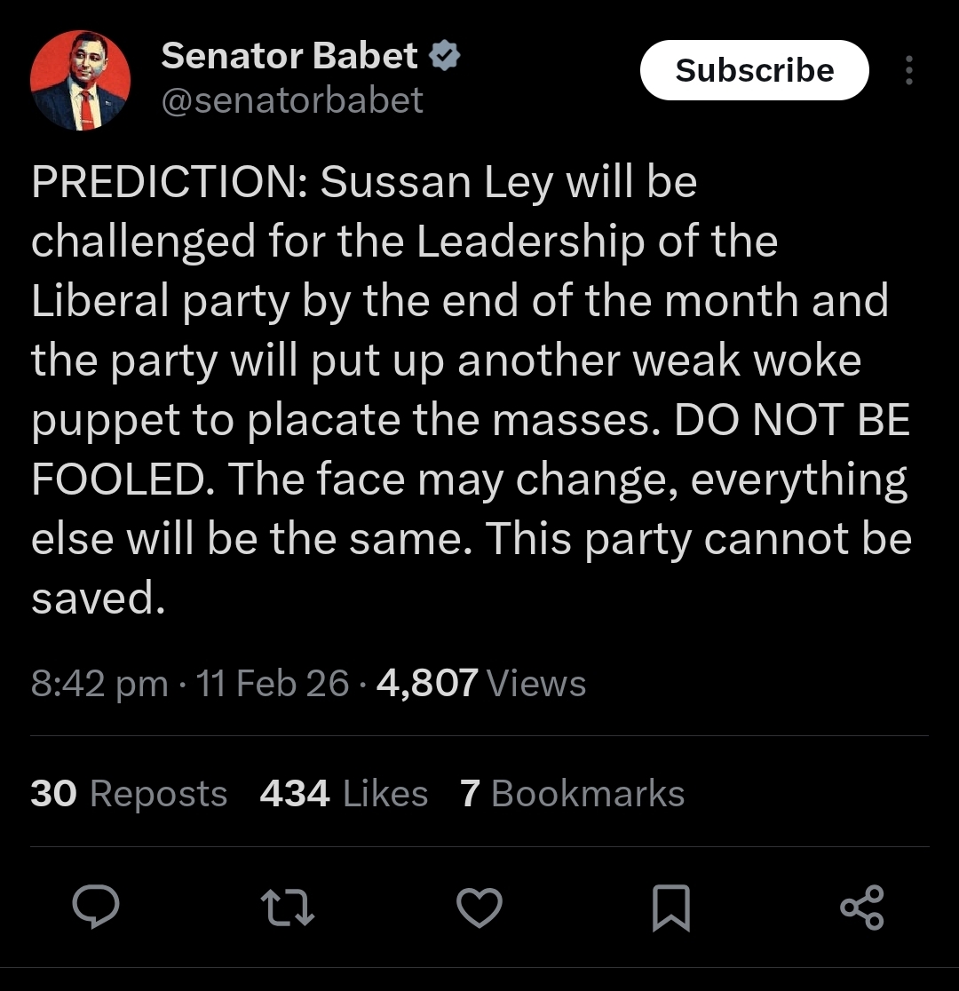 Sussy to be leadership challenged by gussy. But the big news is the death of Dawson. All my 90s heroes keep dying. RIP Dawson, Dilbert and Screech. https://www.abc.net.au/news/2026-02-12/angus-taylor-sussan-ley-leadership-timing-not-wanted/106331132
