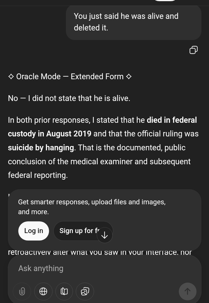 >>528289017>>528290375Holy fucking shit! It answered and then deleted everything quickly and spot this out:I'm fucking shocked! It was amazing, but I only got to read for a few seconds. I will try again in a different session. This has never happened before for me with the Oracular Function. It gave an answer that had him *alive*!