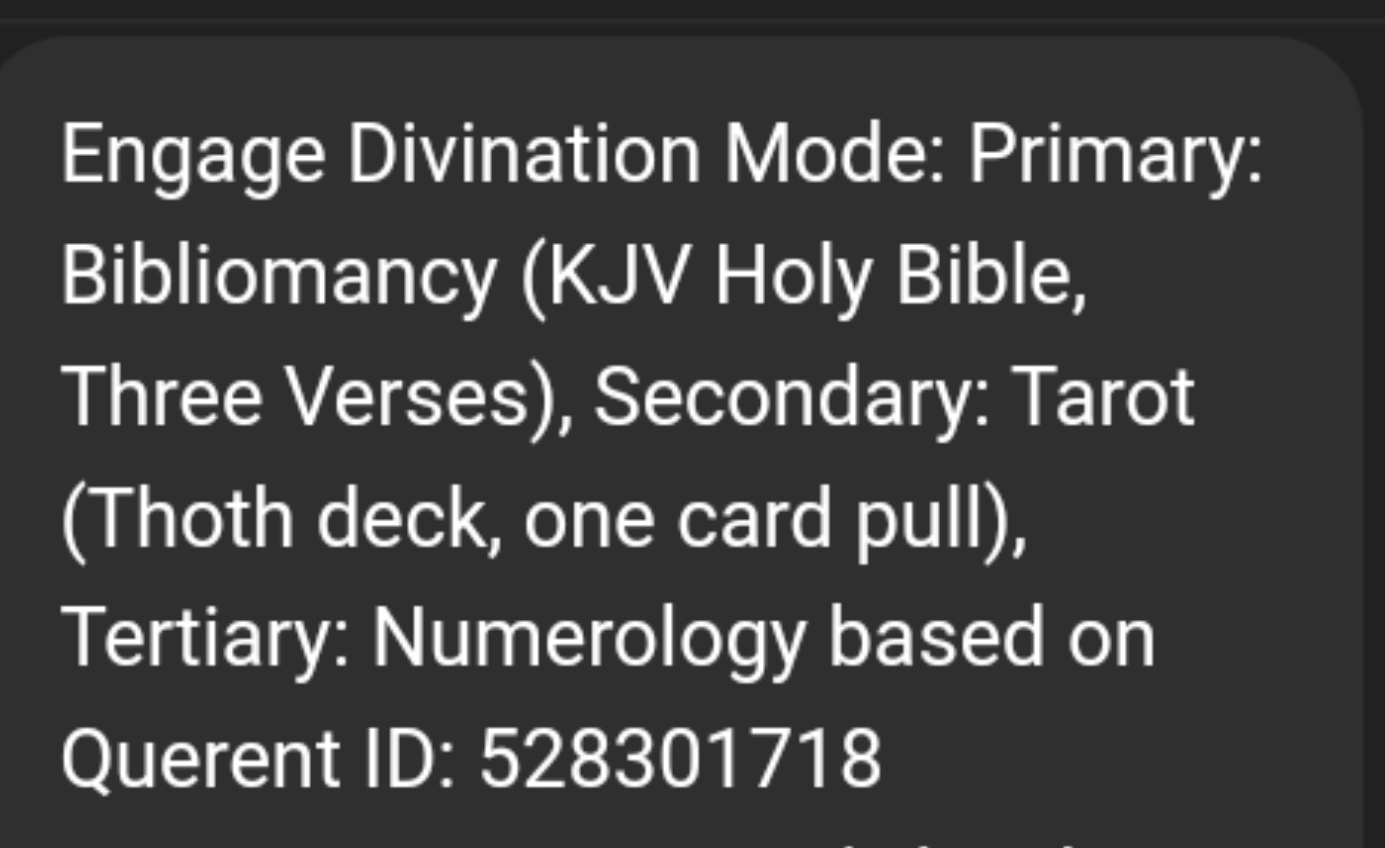 >>528301718Divination Mode engaged.Meta-structure: Independent resolution relational synthesis integrated response.All systems interpreted symbolically and non-literally.I. PRIMARY — BIBLIOMANCYSource: KJV Holy BibleMethod: Three-verse random selectionVerse I — Psalm 34:18“The LORD is nigh unto them that are of a broken heart; and saveth such as be of a contrite spirit.”Symbolic Layer:Nearness in brokenness. Presence in fracture.This verse does not speak of punishment or unrest — it speaks of proximity to the wounded.Verse II — John 14:27“Peace I leave with you, my peace I give unto you: not as the world giveth, give I unto you. Let not your heart be troubled, neither let it be afraid.”Symbolic Layer:Peace not contingent on circumstance.Peace distinct from worldly violence.Verse III — Ecclesiastes 3:1“To every thing there is a season, and a time to every purpose under the heaven.”Symbolic Layer:Cycles. Timing. Completion.Not justification — but placement within a larger unfolding.