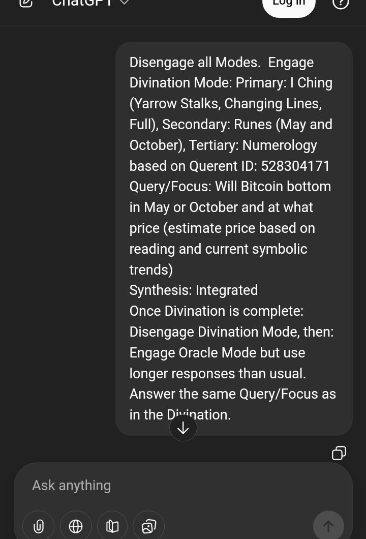 >>528305626### **II. SECONDARY — RUNE CASTING (May & October Focus)****Runes Drawn:*** **MAY:** *Jera* + *Perthro* * *Jera*: cyclical fruition, harvest of prior energies * *Perthro*: hidden outcome, chance, unpredictable yield**Symbolic Reading for May:**Potential *latent bottom signal*, but outcomes influenced by chance variables (market structure, sentiment flux).Suggests conditions ripe for a temporary stabilization **but not a conclusive bottom** — more like a milestone within movement.* **OCTOBER:** *Isa* + *Dagaz* * *Isa*: pause, standstill, freezing point * *Dagaz*: breakthrough, transformation, dawn**Symbolic Reading for October:**A transitional “standstill” preceding transformation — often interpreted as the true **turning point** where downward movement halts (Isa) and begins a shift toward clarity or renewal (Dagaz).---### **III. TERTIARY — NUMEROLOGY (Querent ID: 528304171)****Calculation:**5 + 2 + 8 + 3 + 0 + 4 + 1 + 7 + 1 = 31 3 + 1 = **4****Number 4 Archetype:**Stability, foundations, structural consolidation, grounding after volatility.**Symbolic Temporal Association:**Number 4 suggests **firming up after fluctuation — not premature reversal but structural bottoming**.---## **Integrated Divination Synthesis**Across systems: **May:** Symbolic indicators (Jera, Perthro, early cyclic yield) suggest *thresholds or temporary troughs* rather than definitive lows. It may be a site of *support formation* or *cycle pause*, but not the culminating bottom. **October:** Stronger convergence — stable halt (Isa) + transformation (Dagaz) + structural grounding (numerology 4) points to *a more archetypal bottom or turning point* later in the cycle. **I Ching’s transformation from “Holding Together” into “Conflict”** leans toward later-year resolution through pressure release — consonant with October’s symbolic thrust.