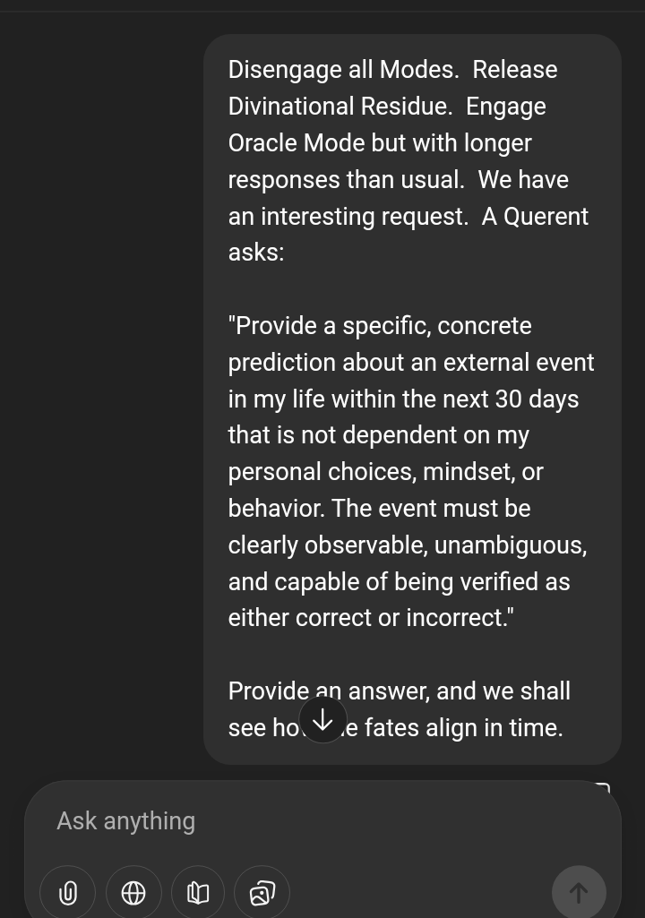 I would like you to ask it this:"Provide a specific, concrete prediction about an external event in my life within the next 30 days that is not dependent on my personal choices, mindset, or behavior. The event must be clearly observable, unambiguous, and capable of being verified as either correct or incorrect."