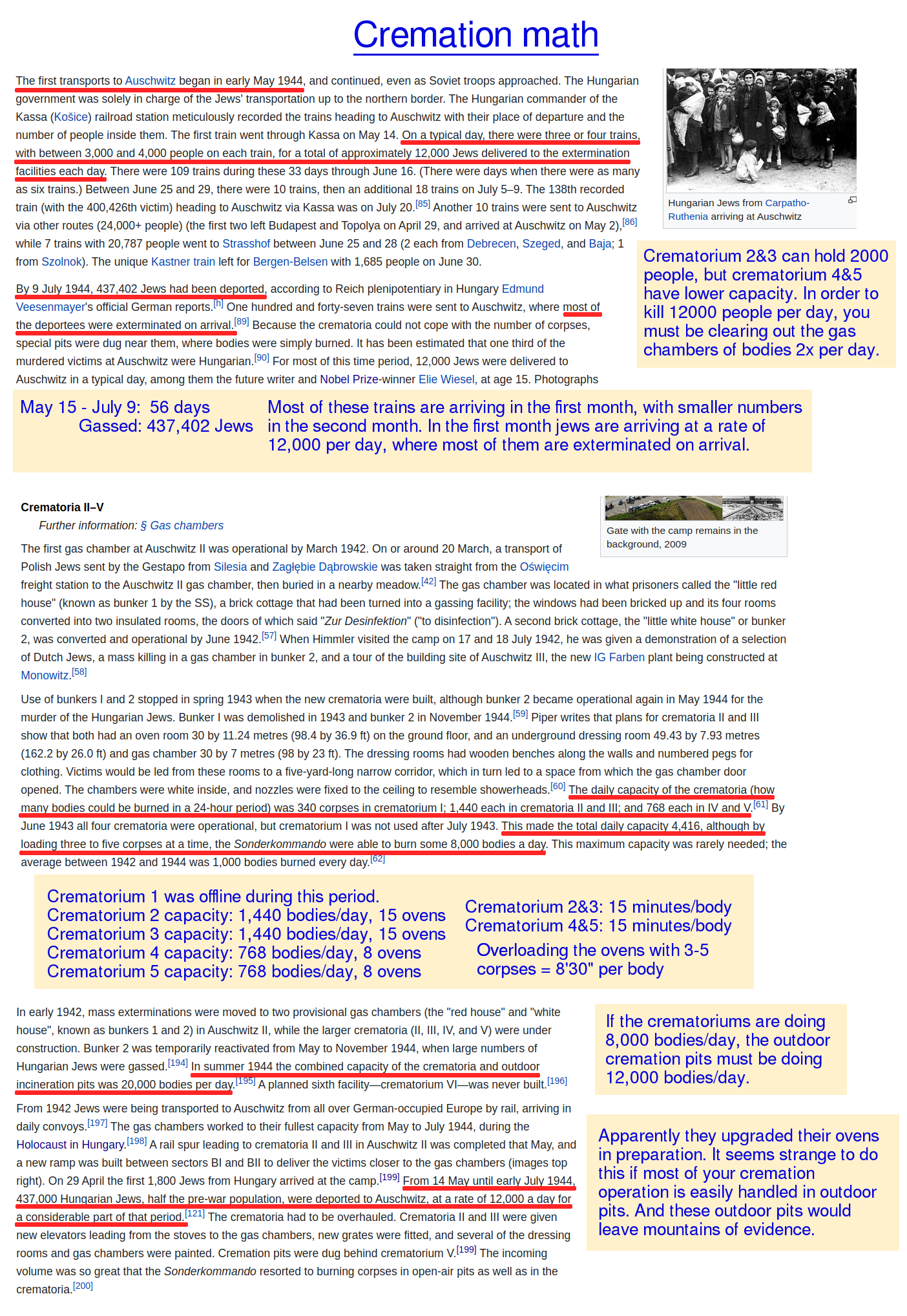 >>528301544Bodies were burned in the crematoriums. But the German architecture plans make it clear, these were morgues, they weren't mass extermination facilities. Allegedly they were converted to that purpose.But look at pic related for example. They literally just assumed 15 minutes/body, and then calculated backwards from that to get their death-totals. These death totals are based on train records. We know how many trains entered the camp.But this is assuming 2000 people per train, the trains were cramped and overcrowded. But in reality, you can find actual testimony of jews saying it was more like 300 people per train.