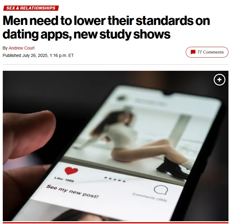 >>528288743>>528289220Two comments the writeup doesn't point out:>Men outnumbered women on that app by 3:1 and by 4:1 on the app in the two cities studied. So most men weren't going to meet a woman no matter what they do.>The behavior pattern of men trying disproportionately for the most attractive women, but women on average selecting men who looked slightly less attractive than themselves, holds up even when the researchers ran a statistical filter that controls for users who select nearly everyone.Direct link to the paper: https://doi.org/10.1371/journal.pone.0327477