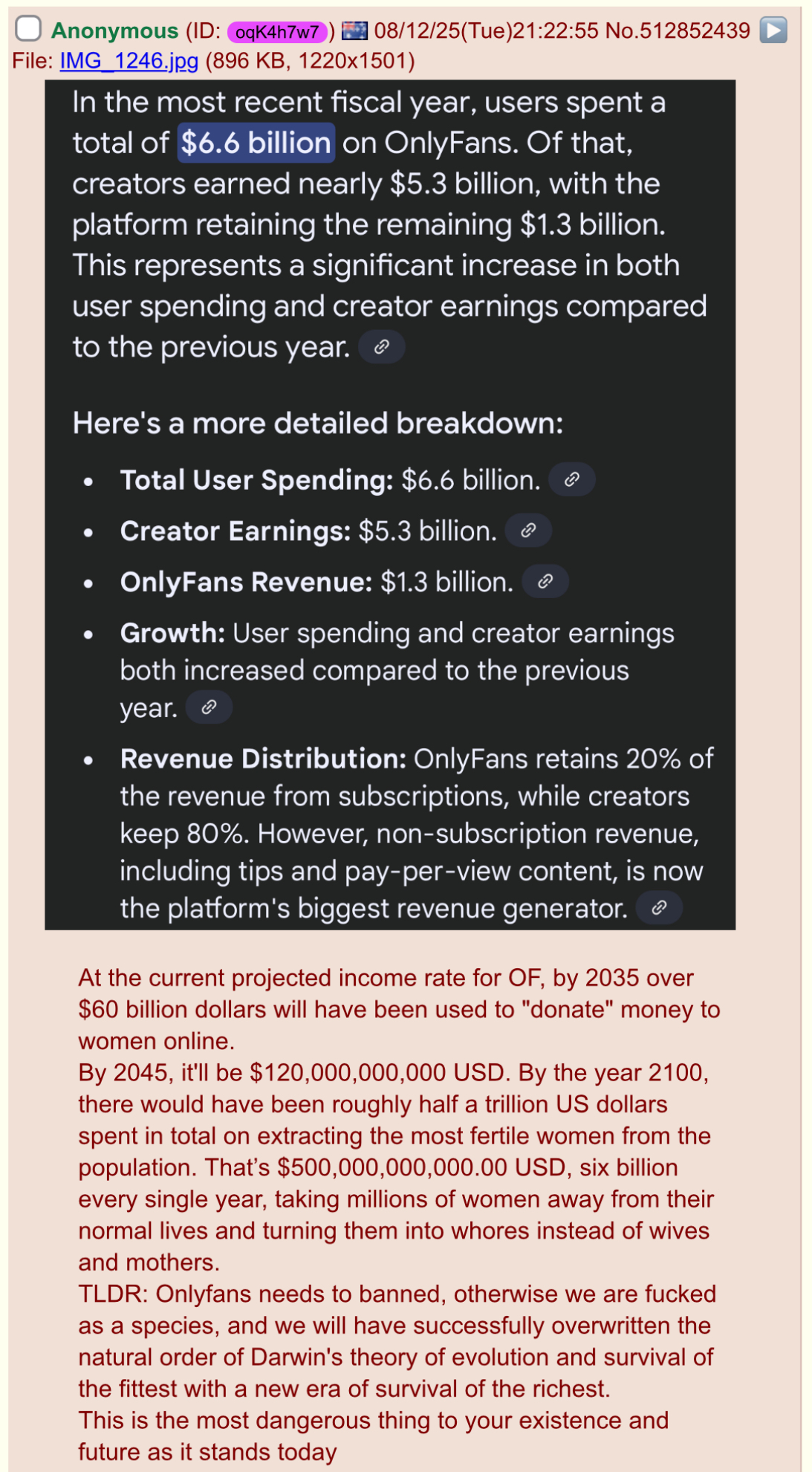 >>528302774That's the one thing that doesn't add up. Most relationships come from online dating now, millions of people have used dating apps. Somehow a massive more amount of men than women are using them. Are they all abducted by Epstein and crew? Do they just not exist? Are they all on OF? Traditionally women cared more about relationships than men so where are they? This doesn't even account for age ranges i.e. women in 20s dating men in their 30s, this just plain has missing women. Its all over social media too, you only find mostly female spaces on OF and similar. Look at the comments of a post or a video, its almost always all men WTF
