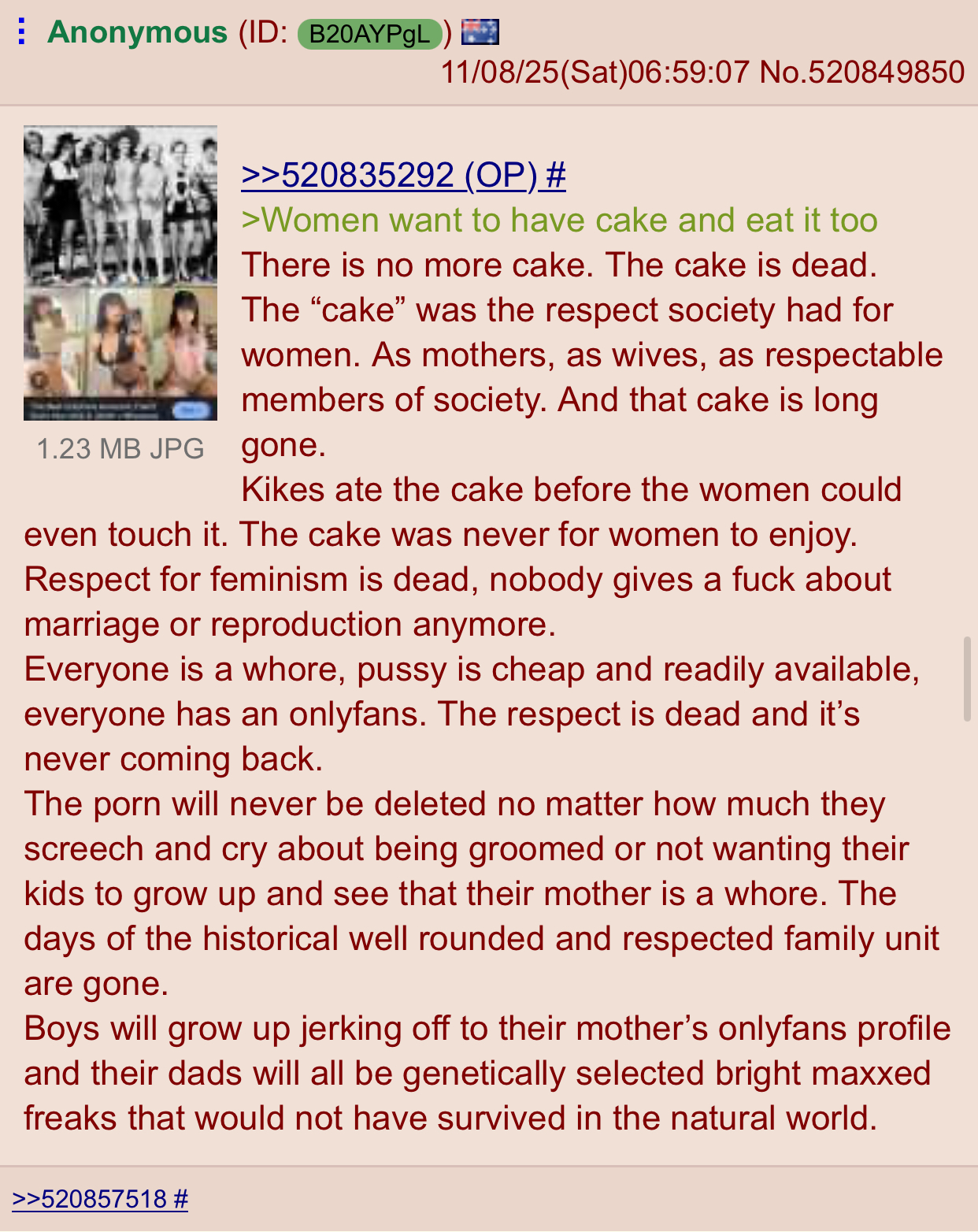 >>528288743>Relationship experts respond with;>men just need to lower their standards and the issue will correct itself.>What do you respond here?Lower the standards how much? Find a fat 45 year old drug addict mother with 3 nigger kids? You know it may be difficult for men to find a relationship but they also have some self-respect and some healthy ego. They are human beings too. We already have lowered our standards more than women deserve but to live a miserable life just for the sake of having a relationship and fucking a hole is way too much.Have experts thought another possibility? That maybe it's not the fault of men for being incels and maybe women have bigger standards than they deserve? Or is this a sexist take and shouldn't be allowed to be discussed?