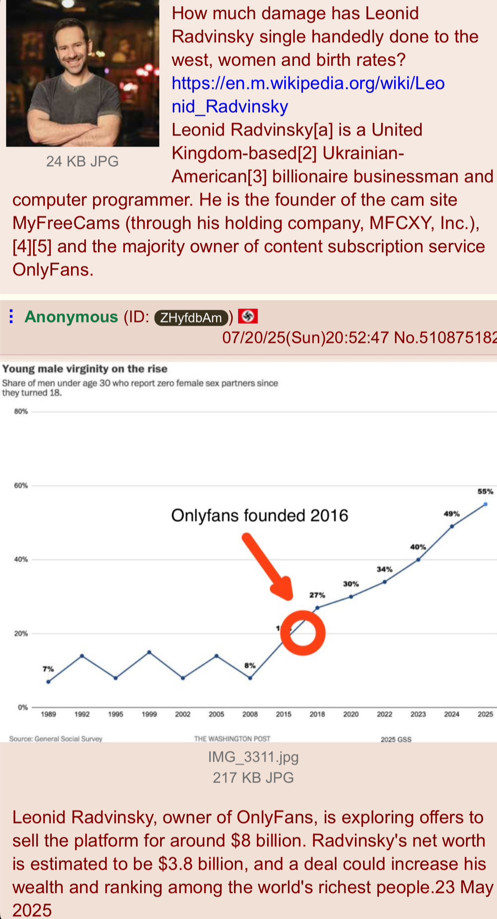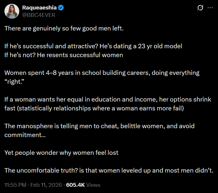 >https://treyhamilton.substack.com/p/most-young-men-are-single-in-2025>https://www.pewresearch.org/about/A study run by the Pew Research Center discovered that 66% of men aged 18-29 aren't having sex or a relationship. At the same the majority of young women in the same age bracket reported being in a relationship and having active sex lives. While the mainstream media didn't pay any attention to the topic, the study gained massive attention on 4chan, with threads reaching bump limit every time, and then jumped to other platforms like YouTube and TikTok. In 2026 everyone's aware of the situation while most videos and articles are getting commends by angry men claiming that getting a girlfriend today is impossible(https://nypost.com/2025/07/26/lifestyle/men-need-to-lower-their-standards-on-dating-apps-new-study-shows/).Relationship experts respond with;>men just need to lower their standards and the issue will correct itself...while urging young men to take a step back from pornography ideals and give regular girls a chanceWhat do you respond here? It looks like this is the most important issue the West is facing right now