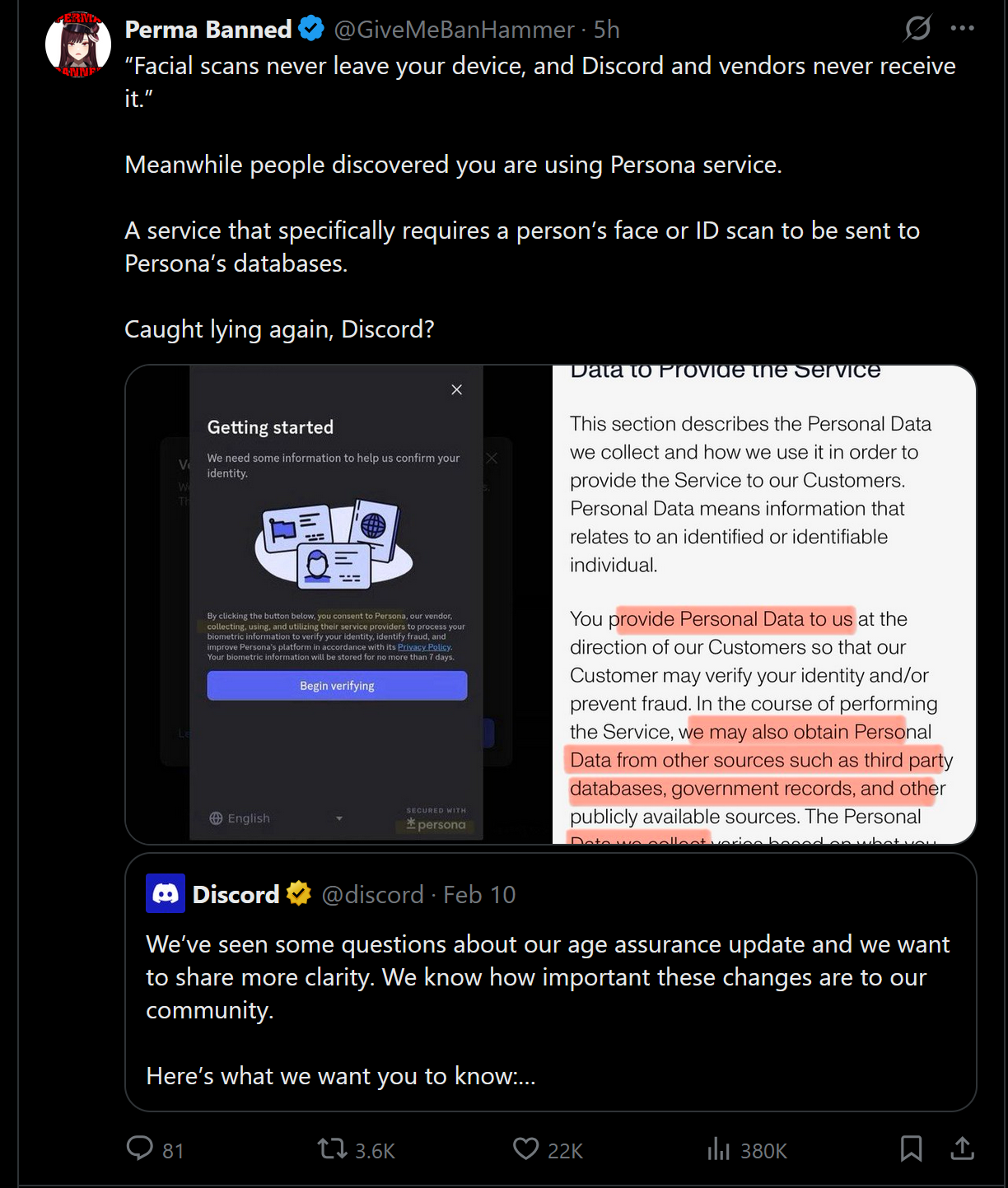 Also in a surprise twist Discord is revealed to have been lying in under 24 hours from announcement of mandatory photo ID upload not being kept and not being uploaded as the leak of their data broker reveals it is a company that EXPLICITLY harvests the ID server side and uploads it for "verification". Who could have seen that coming? Pajeet CEO intelligence. The only thing unusual is it being revealed as a lie in 24 hours and not the usual couple months