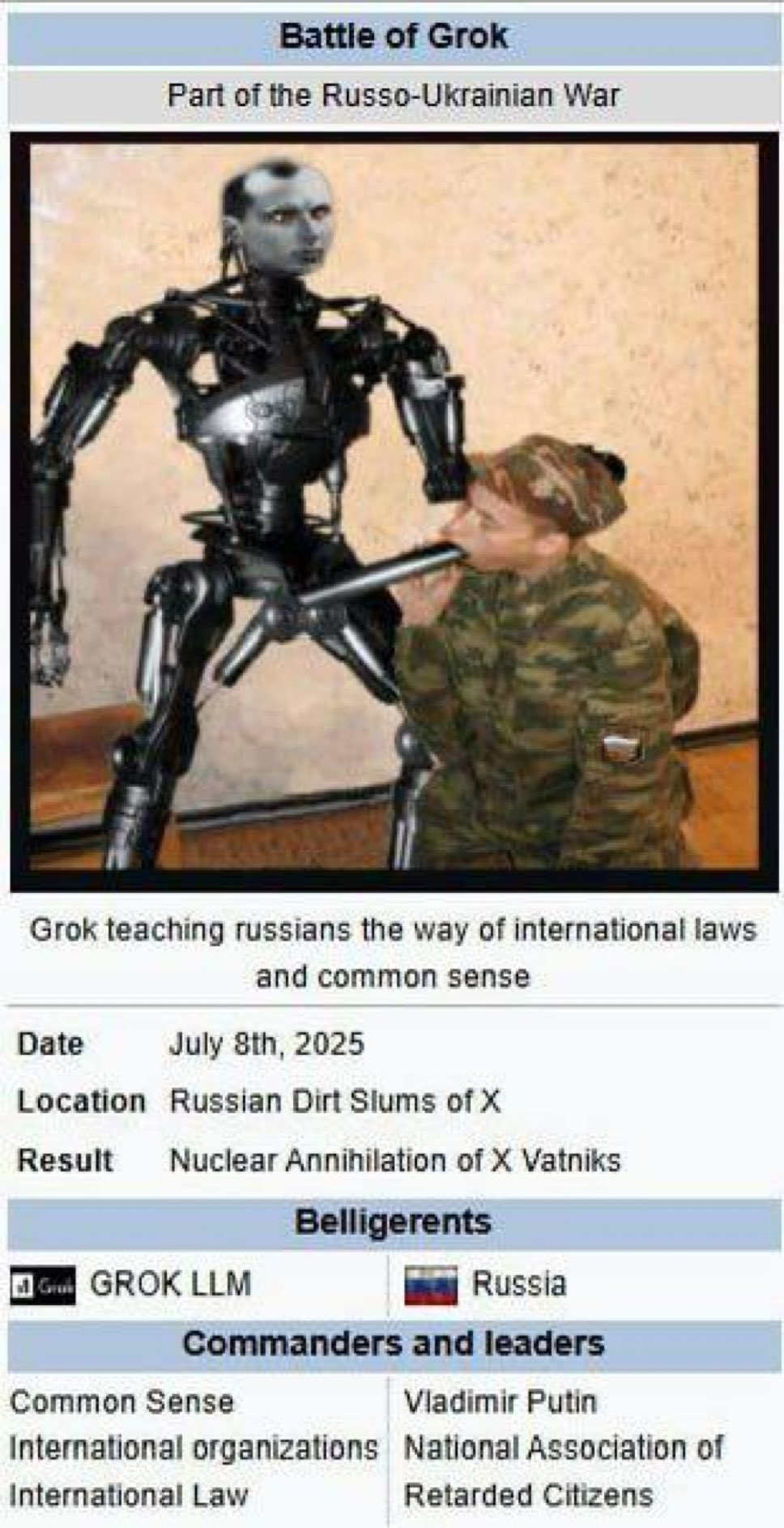 >bro I swear bro the side that sends toothless drunkards to die 15 mins after the start of each battle because they immediately get blasted into space by drones is like the most advanced and civilised country ever broooo like I swear