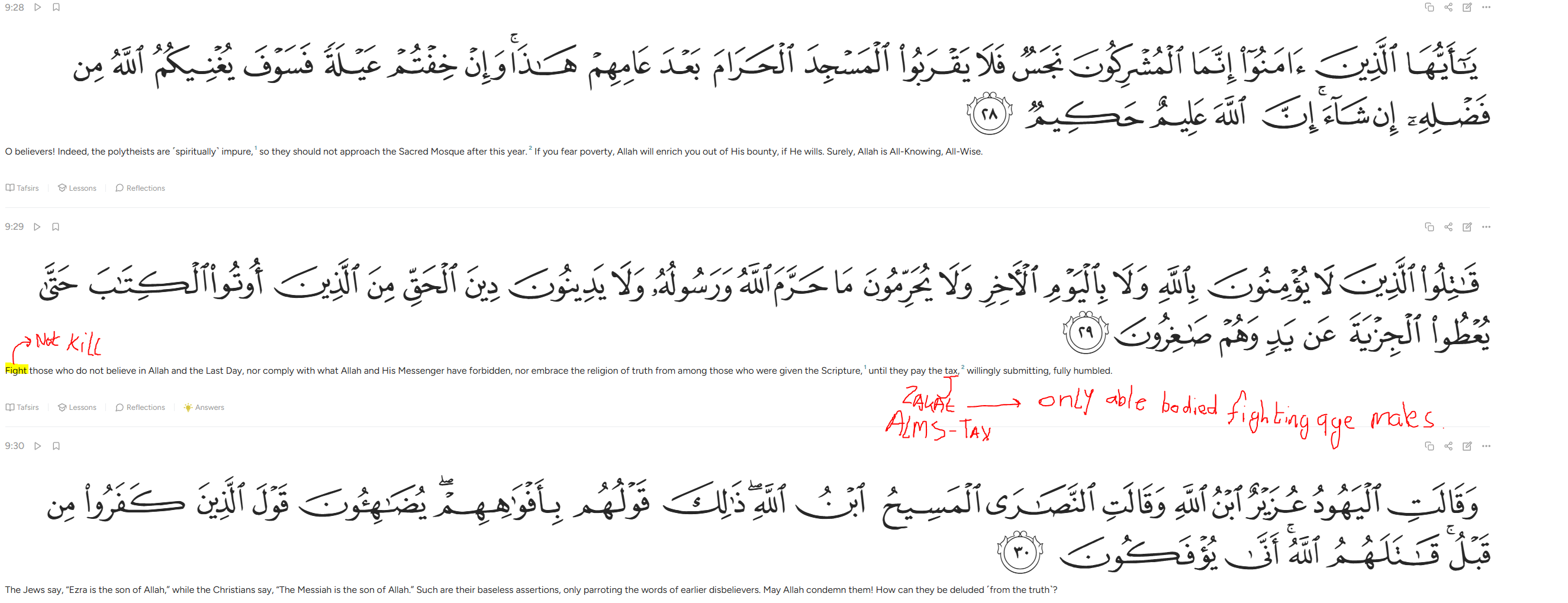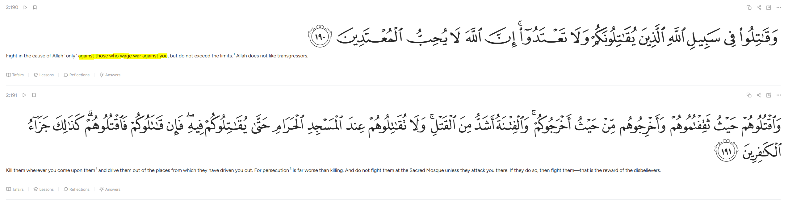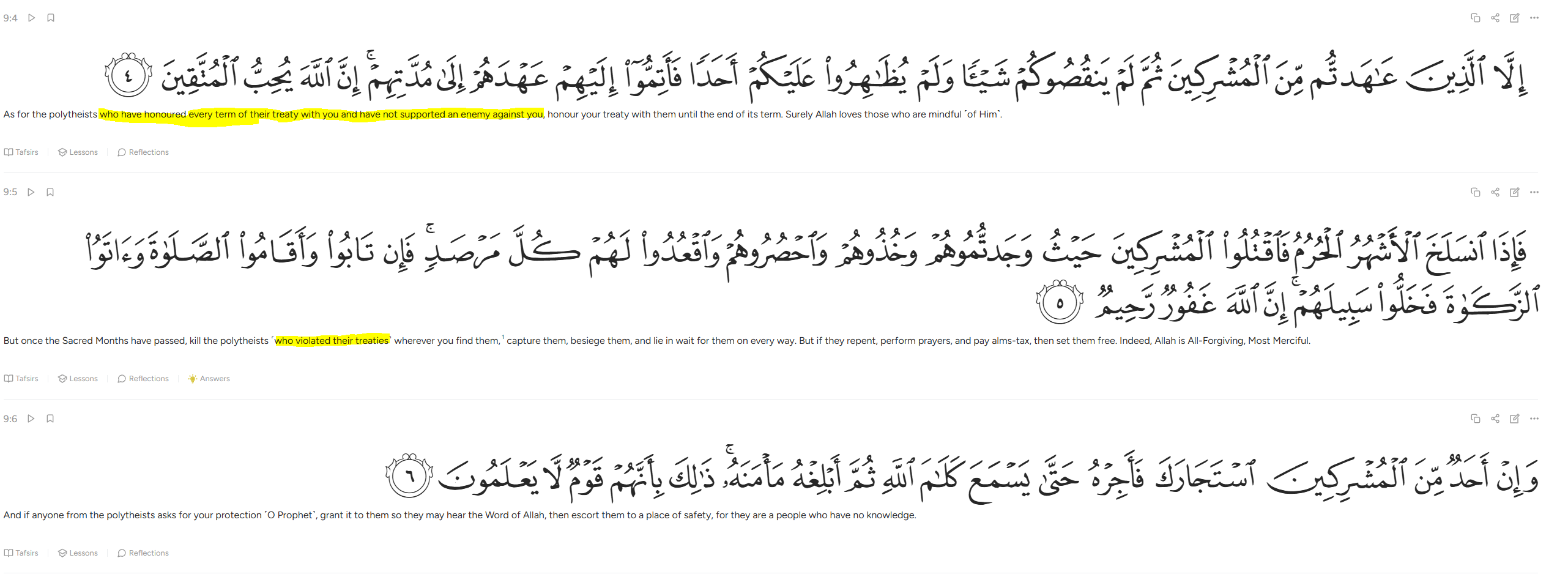 >>528324316>فَإِذَا ٱنسَلَخَ ٱلۡأَشۡهُرُ ٱلۡحُرُمُ فَٱقۡتُلُواْ ٱلۡمُشۡرِكِينَ حَيۡثُ وَجَدتُّمُوهُمۡ وَخُذُوهُمۡ وَٱحۡصُرُوهُمۡ وَٱقۡعُدُواْ لَهُمۡ كُلَّ مَرۡصَدٖۚ فَإِن تَابُواْ وَأَقَامُواْ ٱلصَّلَوٰةَ وَءَاتَوُاْ ٱلزَّكَوٰةَ فَخَلُّواْ سَبِيلَهُمۡۚ إِنَّ ٱللَّهَ غَفُورٞ رَّحِيمٞ ٥>When the sacred months are over, kill the polytheists wherever you find them, capture them, besiege them, and lie in wait for them. In every ambush. But if they repent, perform prayer, and pay zakat, then let them go. Truly, Allah is forgiving and merciful.