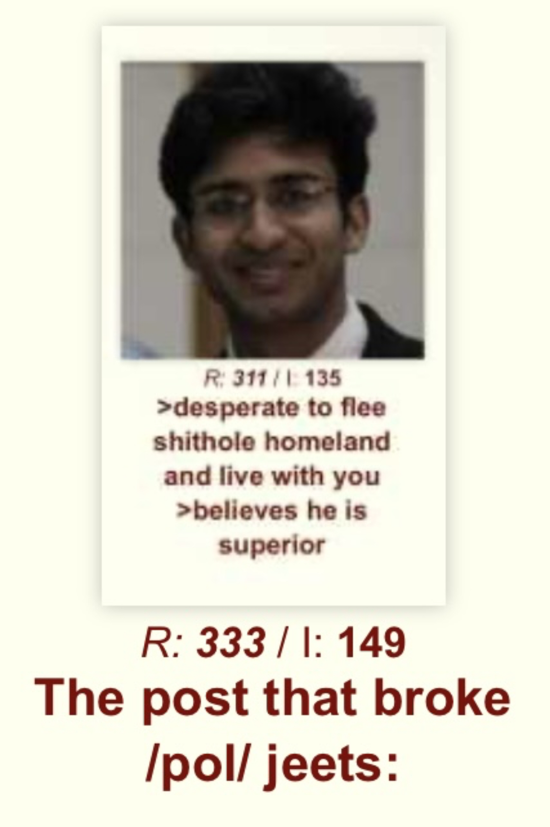 >>528382664Low quality bait>Indians aren't a threat>Hindu culture is close to Japanese culture>changing the filename of an AI image to try and make it look authenticJfc browns really are insufferable. Even their trolling is gay as fuck.