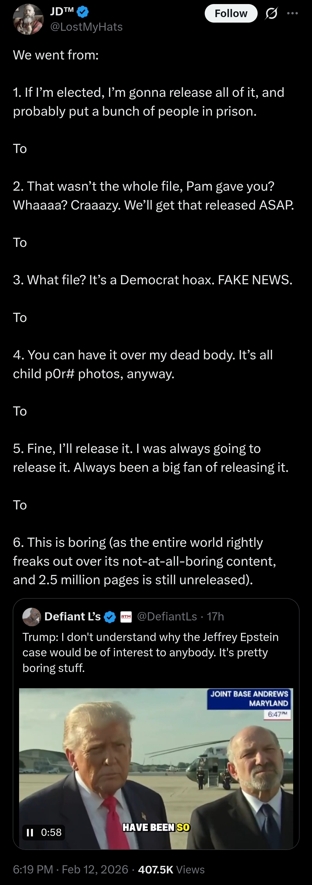 >>528394238You just don't understand.As someone who pays for X he's an impatient moron.Anything less than (politician or celebrity he doesn't like) getting no-knocked in the middle of the night means Trump is PROTECTING PEDOFILES.