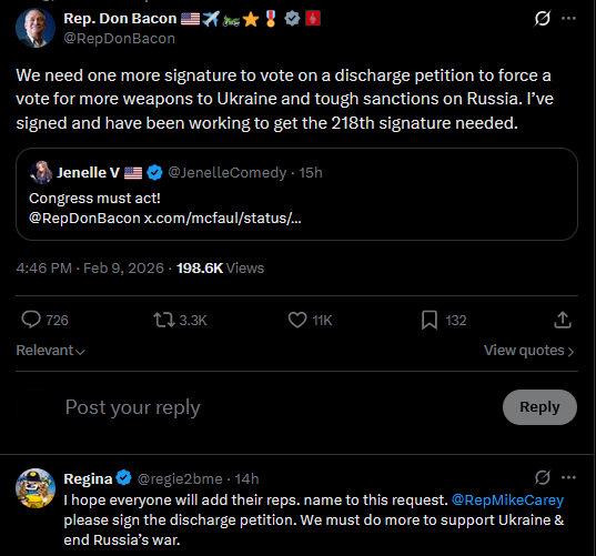 We need one more signature to vote on a discharge petition to force a vote for more weapons to Ukraine and tough sanctions on Russia. I’ve signed and have been working to get the 218th signature needed.https://x.com/RepDonBacon/status/2020902158137278504?s=20>9thCongress must act!@RepDonBaconhttps://x.com/JenelleComedy/status/2020895920087609566?s=20>9thTrump and the US Congress should work together to provide funding for these PAC-3 interceptors. It’s tragic that we sit by idly and watch these attacks happen.https://x.com/McFaul/status/2020773896522494368?s=20>9th