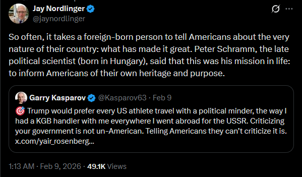 So often, it takes a foreign-born person to tell Americans about the very nature of their country: what has made it great. Peter Schramm, the late political scientist (born in Hungary), said that this was his mission in life: to inform Americans of their own heritage and purpose.https://x.com/jaynordlinger/status/2020667404271964345?s=20>2h>Trump would prefer every US athlete travel with a political minder, the way I had a KGB handler with me everywhere I went abroad for the USSR. Criticizing your government is not un-American. Telling Americans they can’t criticize it