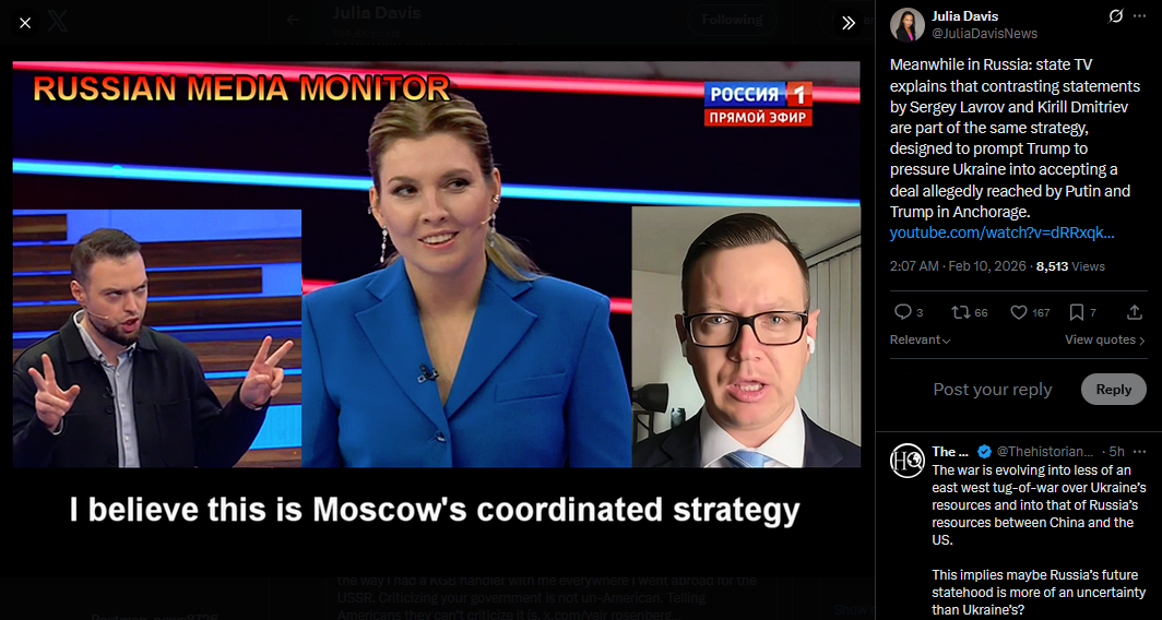 Meanwhile in Russia: state TV explains that contrasting statements by Sergey Lavrov and Kirill Dmitriev are part of the same strategy, designed to prompt Trump to pressure Ukraine into accepting a deal allegedly reached by Putin and Trump in Anchorage.https://youtube.com/watch?v=dRRxqko4NPo&list=PLLWQyEN3YRo41QwWb7e8J5YjBX80WmGtGhttps://x.com/JuliaDavisNews/status/2021043189629530438?s=20
