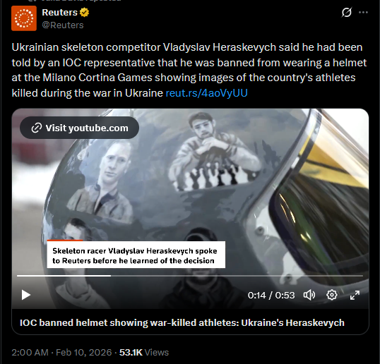 Ukrainian skeleton competitor Vladyslav Heraskevych said he had been told by an IOC representative that he was banned from wearing a helmet at the Milano Cortina Games showing images of the country's athletes killed during the war in Ukraine https://reut.rs/4aoVyUUhttps://x.com/Reuters/status/2021041428890255789?s=20>10thhttps://streamable.com/8taf3j