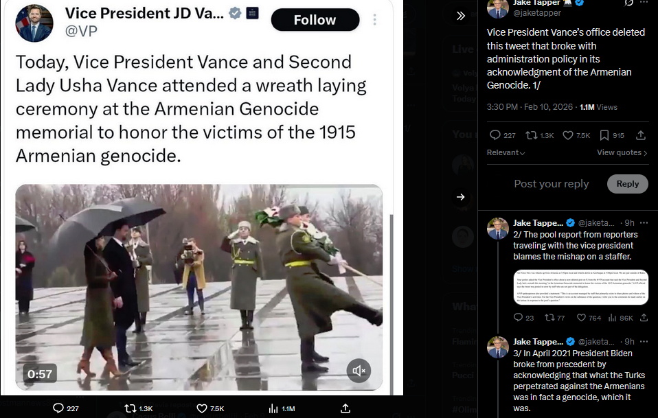 Vice President Vance’s office deleted this tweet that broke with administration policy in its acknowledgment of the Armenian Genocide. 1/https://x.com/jaketapper/status/2021245425399861694?s=20>9th2/ The pool report from reporters traveling with the vice president blames the mishap on a staffer.3/ In April 2021 President Biden broke from precedent by acknowledging that what the Turks perpetrated against the Armenians was in fact a genocide, which it was.4/ President Trump returned to his official policy of refusing to call it a genocide last April. -30-