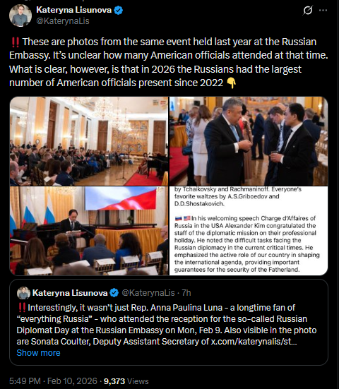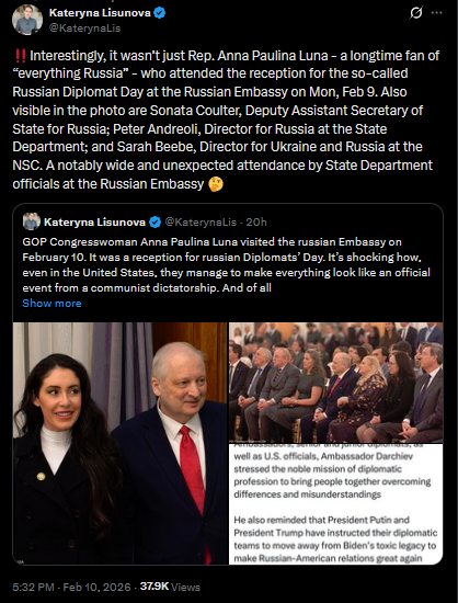 Interestingly, it wasn’t just Rep. Anna Paulina Luna - a longtime fan of “everything Russia” - who attended the reception for the so-called Russian Diplomat Day at the Russian Embassy on Mon, Feb 9. Also visible in the photo are Sonata Coulter, Deputy Assistant Secretary of State for Russia; Peter Andreoli, Director for Russia at the State Department; and Sarah Beebe, Director for Ukraine and Russia at the NSC. A notably wide and unexpected attendance by State Department officials at the Russian Embassy https://x.com/KaterynaLis/status/2021276135602979028?s=20>10thpic 1https://files.catbox.moe/u922vv.jpgpic 2https://files.catbox.moe/d76hvh.jpgpic 3https://files.catbox.moe/os6pkx.jpg