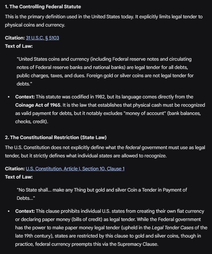 >>528418943>)literally spends paragraphs explaining that money is fictional when absolutely zero money he claims as fictional is fictional. Gemini agrees with me that money of account is not legal tender. I'm therefore allowed to call it fictional fiat currency, since physical fiat currency is legal tender. Pic related.>Retard, it existing in reality on a ledger in some 1's and 0's entry doesn't make it fictional.I would beg to differ since it's not legal tender. Pic related.>You also were supposed to explain what exactly was the context that I didn't include,I've already explained the wider context and part of it is visible in the screenshots.>retarded kikeNot a kike.>which youexplicitly accused me of removingWhy would you crop that tiny part out from our exchange?>and instead of trying to argue why money is fictionalGemini (Pro model selected) agrees with me that money of account is not legal tender. It's therefore fictional yet spendable legal tender, because you can spend it in lieu of actual legal tender at 1:1 ratio. And even exchange it for legal tender at a 1:1 ration (minus bank fees and commissions), but only in so far as bank reserves last.>you were supposed to argue why you never said money doesn't exist.Like I said to the Brazoolian (it's not an insult as much as a term of endearment), we need to define what "exists" even means, first. If you're going to be this pedantic up tight about everything.