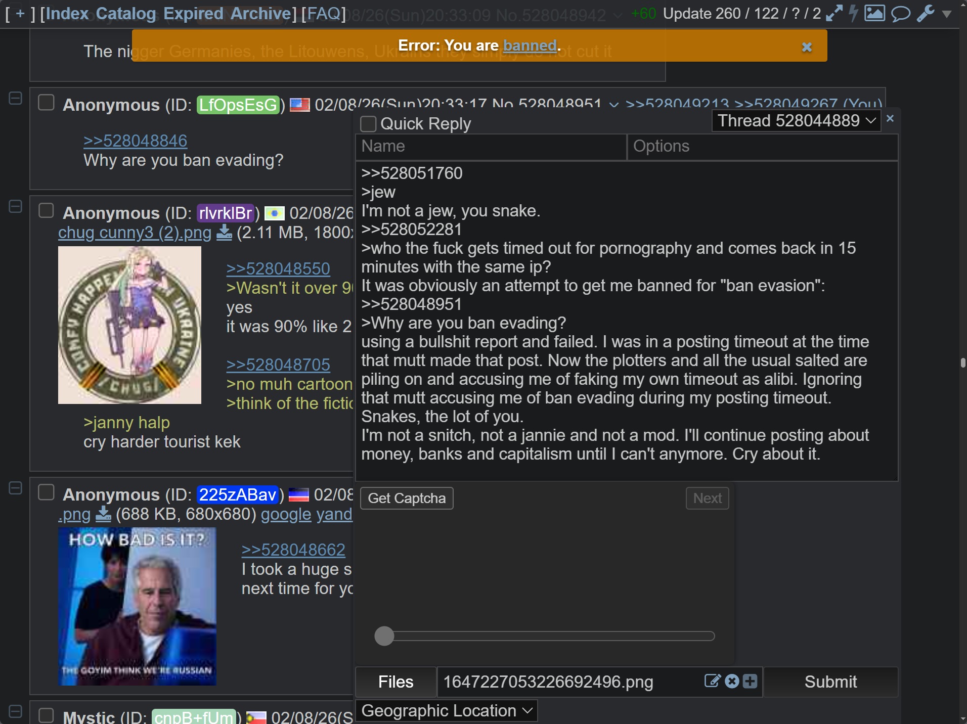 >>528434041>His last post was over an hour ago. Maybe he got Ferengi'd too.Damn it, stop blaming me for bans and everything. Why don't you blame jew or Portuguese? It's always immediately me, me, me you blame. And I never report. I just come for the bantz, debates and (You)s.