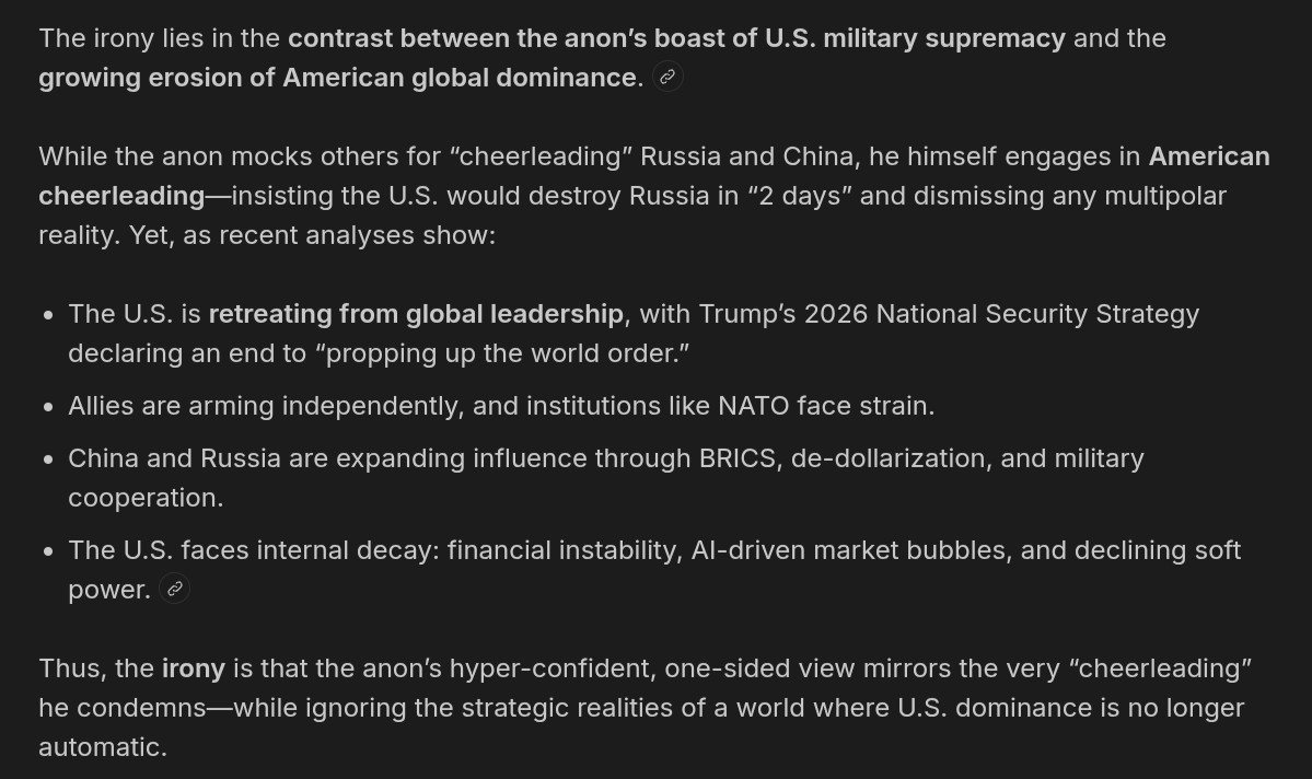 >528434554>Ok. Still has nothing to do with me.However you try to cope, have seen you say one thing and reality the opposite so many times already.>Plus, I've been a /chug/ regular since the very beginning.Did you ever talk about the SMO or Geopolitics? I can't remember. It's all cargocultist this, monetarist that, look at my dish.
