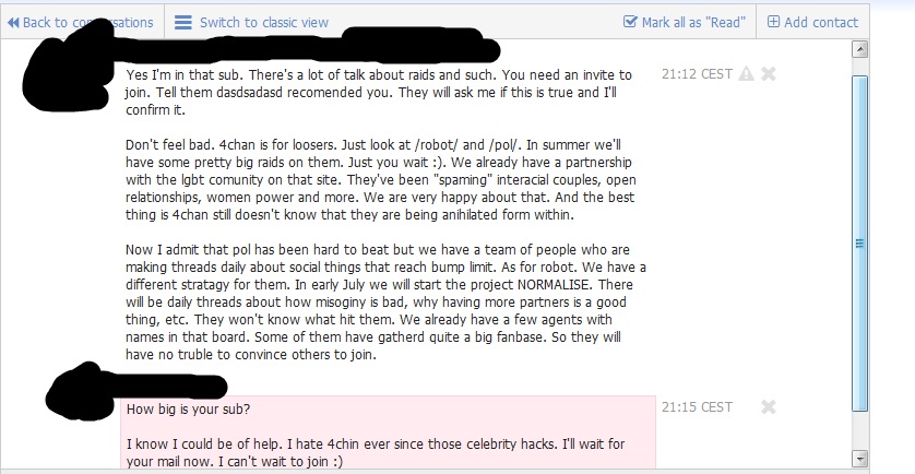 >>528448048I'm glad you feel important, but imho you're not. Nor are my posts. Nor is /pol/ or any other board. That's just my opinion.It sure is nice to feel important. Sure is nice to feel like you're surrounded by secretly powerful people, being given glimpses of information privy to only a few. I concede that it's extremely likely that governments watch the posts here, but they do that on Facebook too, and Facebook has spawned a lot fewer shooters than this cesspit.