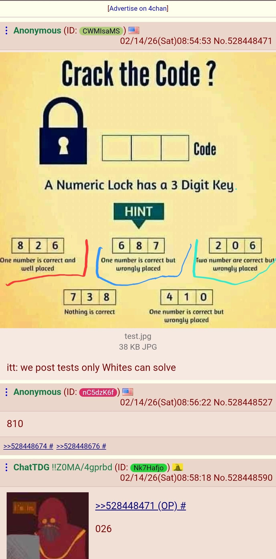 >>528453584>826ONE NUMBER IS CORRECT, BUT WRONGLY PLACEDIf both 6 and 2 are wrongly placed, you will be left with just 8. Which is excluded because of 738, where nothing is correct. 206 and 410 tell you that 0 cant be the third digit. So 026 is the only answer. How do you people even solve the captcha...