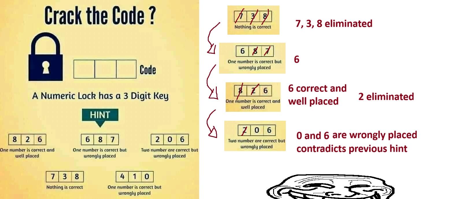 >>528453603>whereas top right says it shouldn't be there.It only says two numbers are correct and wrongly placed. It doesn't say anything about the third number.