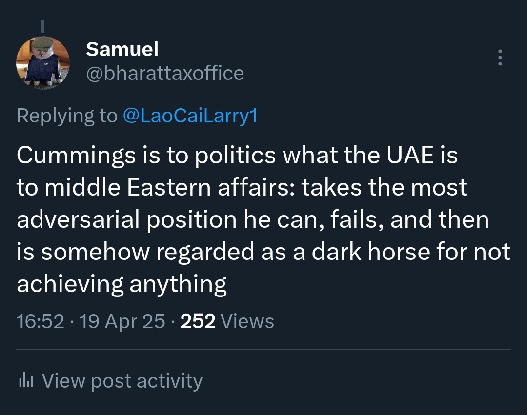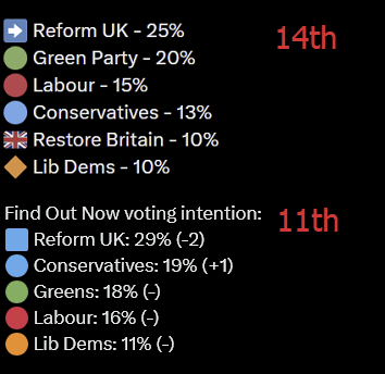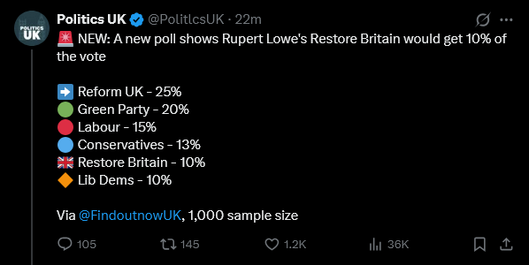 One of the most uncanny things may occur if this Restore thing actually kicks off and isn't just a flash in the pan Restore's potential voters would all be coming from Reform, and perhaps a small amount would be coming from non-voters. Lowe isn't getting anybody from the other parties who haven't already left them for Reform.If we're charitable and say Reform loses up to 50% of its voterbase nationwide, it would of course not come in 1st place in most constituencies across the country. Obviously neither would Restore.But that doesn't mean we'd necessarily be looking at a Labour-Green coalition in this scenario. In a massive amount of constituencies where Reform would have won the seat going into the next election, the runner-up is NOT Labour, whose polling is disastrous nearly everywhere.We would wake up the next day very baffled to see Kemi Badenoch leading the largest party in parliament.