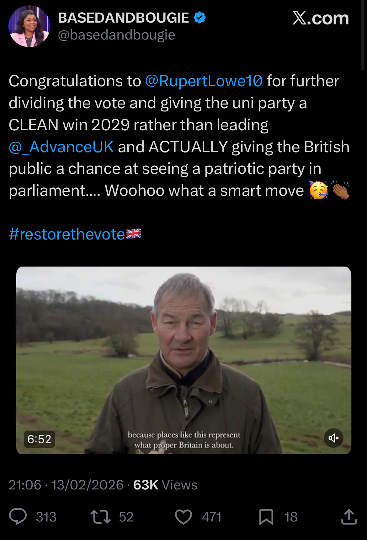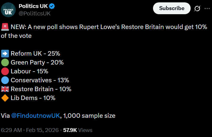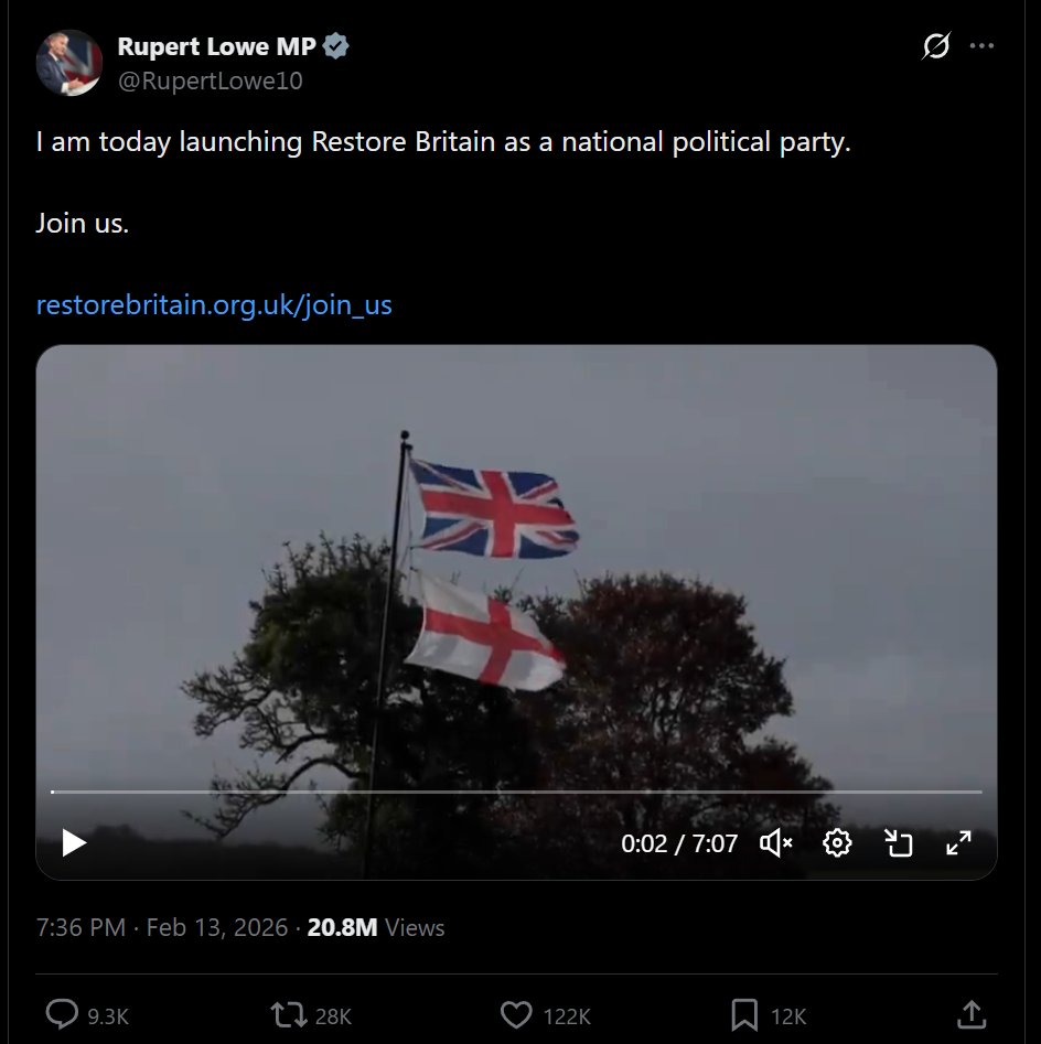Ed Davey on suicide watch Important news. The first opinion poll conducted since I announced yesterday that Restore Britain would become a national political party has us on 10%.In this poll, we are ahead of the Lib Dems.10%. In 24 hours.I call that a bloody good start.We have to work hard, get lucky and be entirely honest with the British people. We need the support of millions of patriots, and there will be difficult days ahead. But seeing the incredible reaction over the last 24 hours, I am increasingly of this view...We can absolutely win the next election.We can Restore Britain.I hope you consider supporting us in that journey.https://x.com/RupertLowe10/status/2022767014364762165?s=20