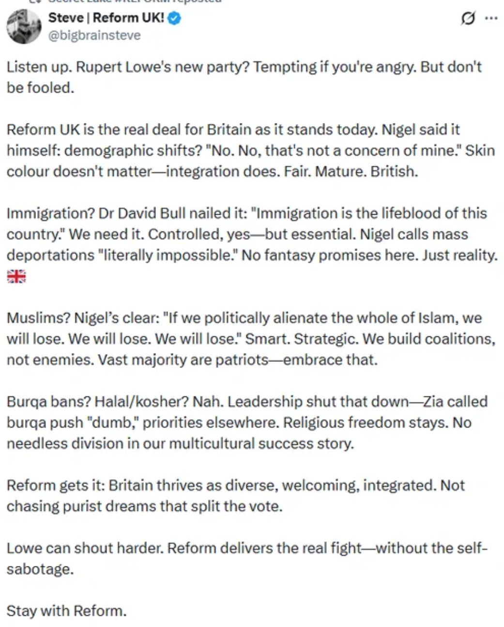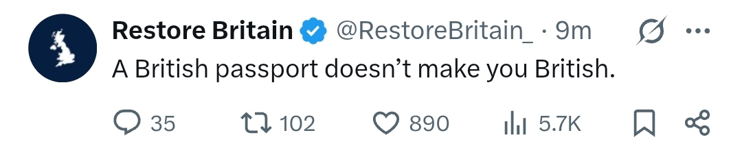 https://xcancel.com/Khaledhzakariah/status/2022652929707065352#m>Is Britain going mad? Seriously, are we going mad?>This is Restore Britain's foreign policy. Written by a man who has staff and money to actually do something serious. >He could have hired researchers. He could have bothered.>Instead, it's simply a silly tweet, "Scrap Foreign Aid" from a man who's offering us nothing but anger. No experience. No expertise. No substance. No serious policies. >Just his own tweets. >If you think this makes him Prime Minister material, you really need to have your head checked. >Not even going to mention that he has the support of Steve Laws and his likes, who simply want to deport every brown, black, Jewish, Muslim, Hindu.........>Are you all going mad?Thank you Khaled Hassan>National Security & Geopolitics Researcher | Council Member, President Herzog's Voice of the People, 150 leaders to represent 15M Jews worldwide.weeeeeeeeeeeeeeeew