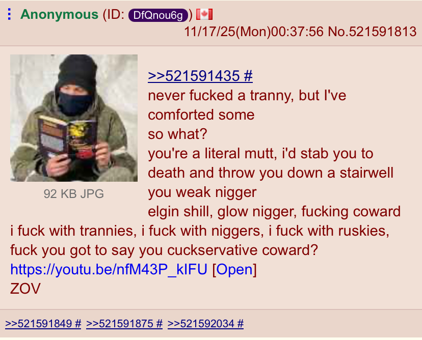 >>528506051>5 bucks says the "finn" is the jannyit's notbut they are on the same discord groupand the other trannies too (gorejeet, usergore, dixsept, finhohol, pygmalion, NAFOtroon, SA kid, a bunch of turks and r/ukr_pigs)so he calls the jannitor once he starts feeling uncomfortable the janny itself may not post, too much n-word makes him uncomfortableif I were to guessthe janny is the SA kid or NAFOmemetroon (he's literal tranny btw)