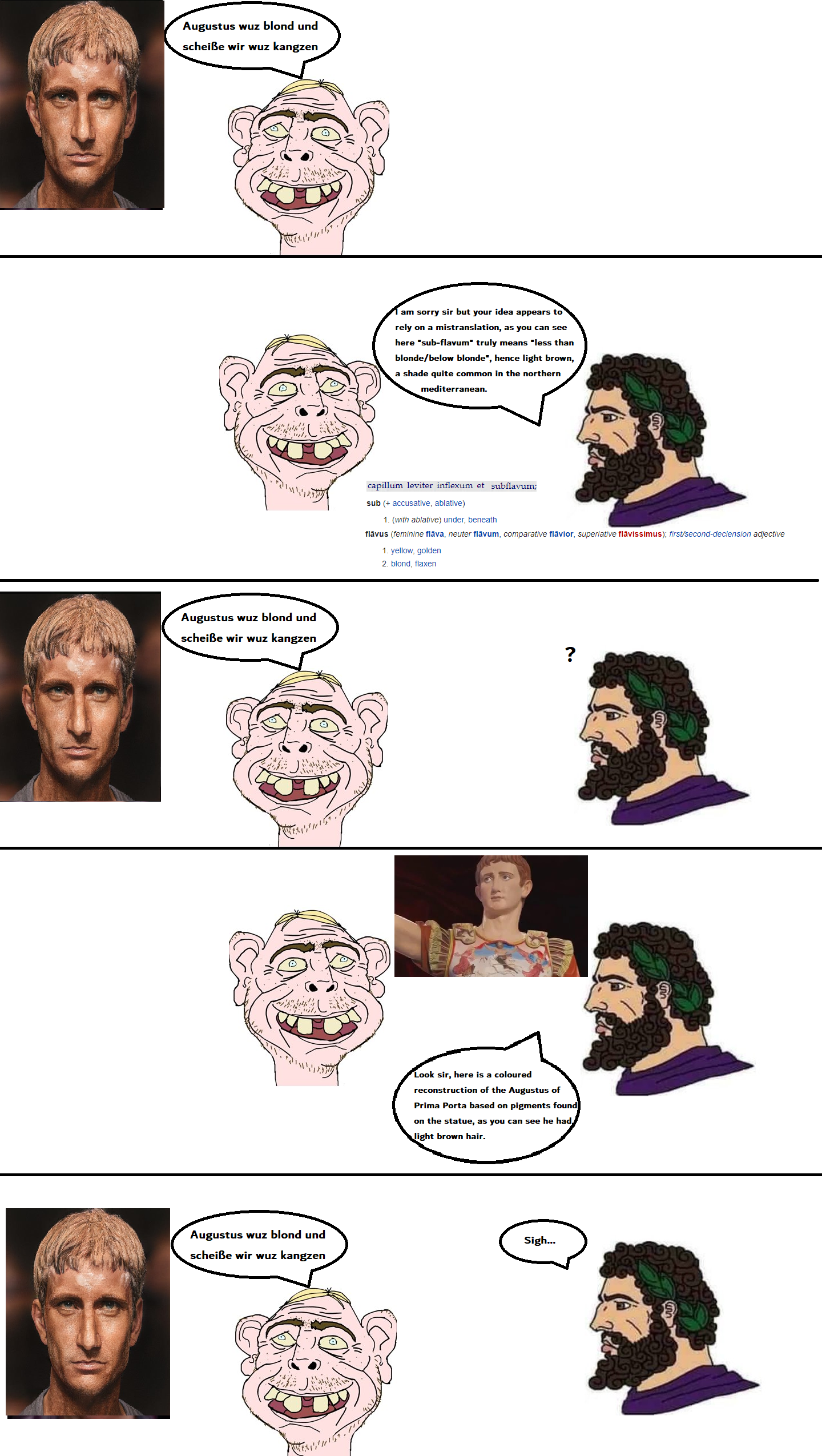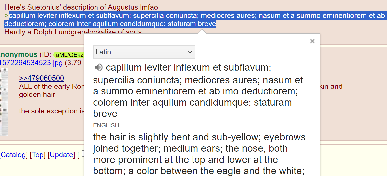 >>528519740>Augustus>blondeAccording to which sources, the ones which e.g. wilfully mistranslate Suetonius' description of Augustus' "subflavum" (i.e. "less than blonde") hair as just "flavum" ("blonde") , while ignoring that Suetonius in the following line also literally said Augustus was a tanned manlet with an hooked nose and an unibrow like an Italian?>"He had clear, bright eyes. His teeth were wide apart, small, and ill-kept; his hair was slightly curly and inclined to golden; his eyebrows met. His ears were of moderate size, and his nose projected a little at the top and then bent ever so slightly inward. His complexion was between dark and fair. He was short of stature."