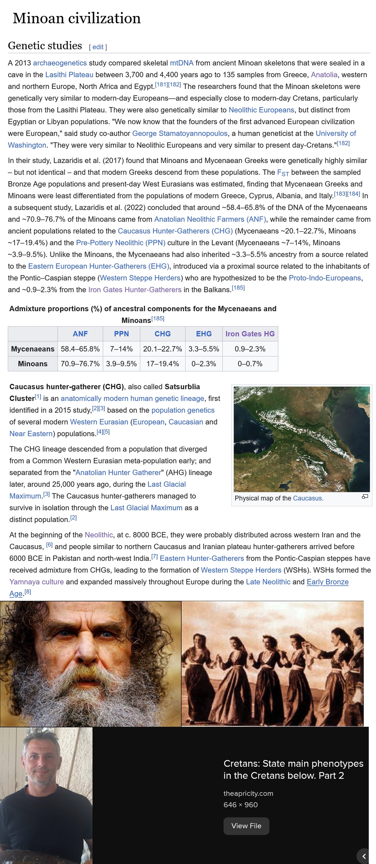 >>528521109>According to Lazaridis etal.2017, both Minoans and Mycenaeans derive most of their ancestry—at least three‑quarters—from the first Neolithic farmers of western Anatolia and the Aegean, along with additional contributions related to populations from the Caucasus and ancient Iran. >The key difference is that the Mycenaeans carry an extra component related to populations from eastern Europe and Siberia, introduced via groups connected to the Eurasian steppe or Armeniado you even understand how white most of these areas once looked?the armenians and nearby areas even still have remnants of dances that look like the germanic druid/wolf cowl motifsagain, you talk big with dna but seem to have no idea how it looks once expressed; how it manifests in the physical world.