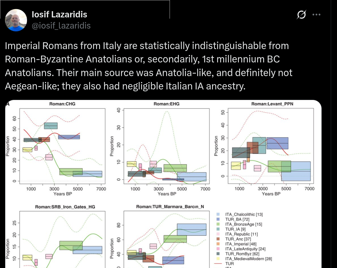 >>528546209Also Lazaridis is wrong. The C6 cluster of Imperial Romans was a mixture of Italic and Anatolian, about half and half. He also says this hasn't been studied in great detail, which is a shame given how much discussion there has been about it online. You can run admix tools yourself to confirm it.https://x.com/iosif_lazaridis/status/2012670831244038433