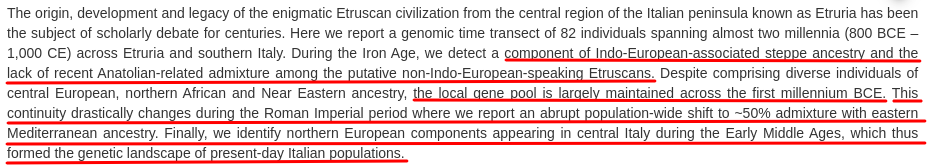 >>528542838>The truth is that the Estruscans founded RomeSettlements have existed in Rome since the Neolithic period.>There is archaeological evidence of human occupation of the area of modern Rome from at least 5,000 years ago, but the dense layer of much younger debris obscures any Palaeolithic and Neolithic sites. Traces of occupation have been found in the general region – including Lavinium and the coast near Ardea – going back to the 15th century BC. The area was home to the Apennine and Proto-Villanovan cultures before the advent of the more regional Latial culture>and were invaded by the Indo-European Latini tribeThe Etruscans had Steppe DNA just like the Latins, they just didn't speak an IE language. How could the Latins invade the Etruscans if they also originated within Italy along them, you retarded lead?>The study concluded that Etruscans (900–600 BC) and the Latins (900–500 BC) from Latium vetus were genetically similar, genetic differences between the examined Etruscans and Latins were found to be insignificant. The Etruscan individuals and contemporary Latins were distinguished from preceding populations of Italy by the presence of ca. 30-40% steppe ancestry>Their DNA was a mixture of two-thirds Copper Age ancestry (EEF + WHG; Etruscans ~66–72%, Latins ~62–75%) and one-third Steppe-related ancestry (Etruscans ~27–33%, Latins ~24–37%) with the EEF component mainly deriving from Neolithic-era migrants to Europe from Anatolia and the WHG being local Western European hunter-gatherers, with both components, along with that from the steppe, being found in virtually all European populations)>not all Etruscan women were portrayed as having blond hair as you insuinateProjection. I said that they represented blondness more in women than in men, not that all Etruscan women were blond. My own post >>528540301 points only 5.3% of the Etruscan samples were blond.