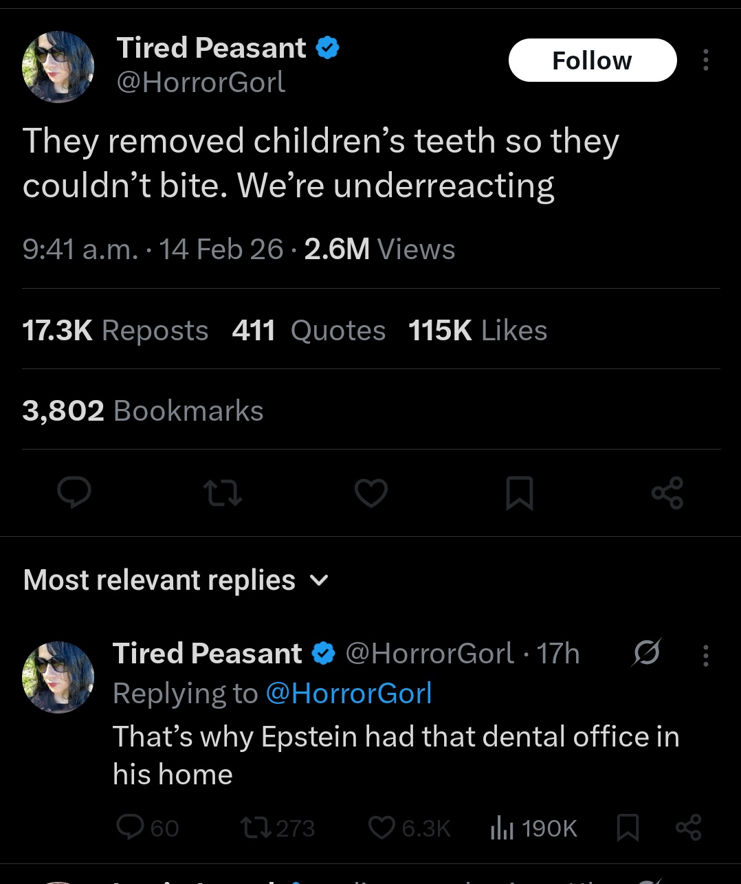 >>528554262Because outrageous claims need proof. Otherwise it’s fucking well poisoning by other jews. They’re doing a reverse holohoax. Make outrageous claims about Epstein, people will doubt them, which then calls the entire thing into question. I do believe they did more heinous shit than pulling teeth for BJs, but we still need proof. Also this brings up the question of “why bother”? Ring gags exist. If they want to torment victims and cause pain there are worse things they could do (and probably did).