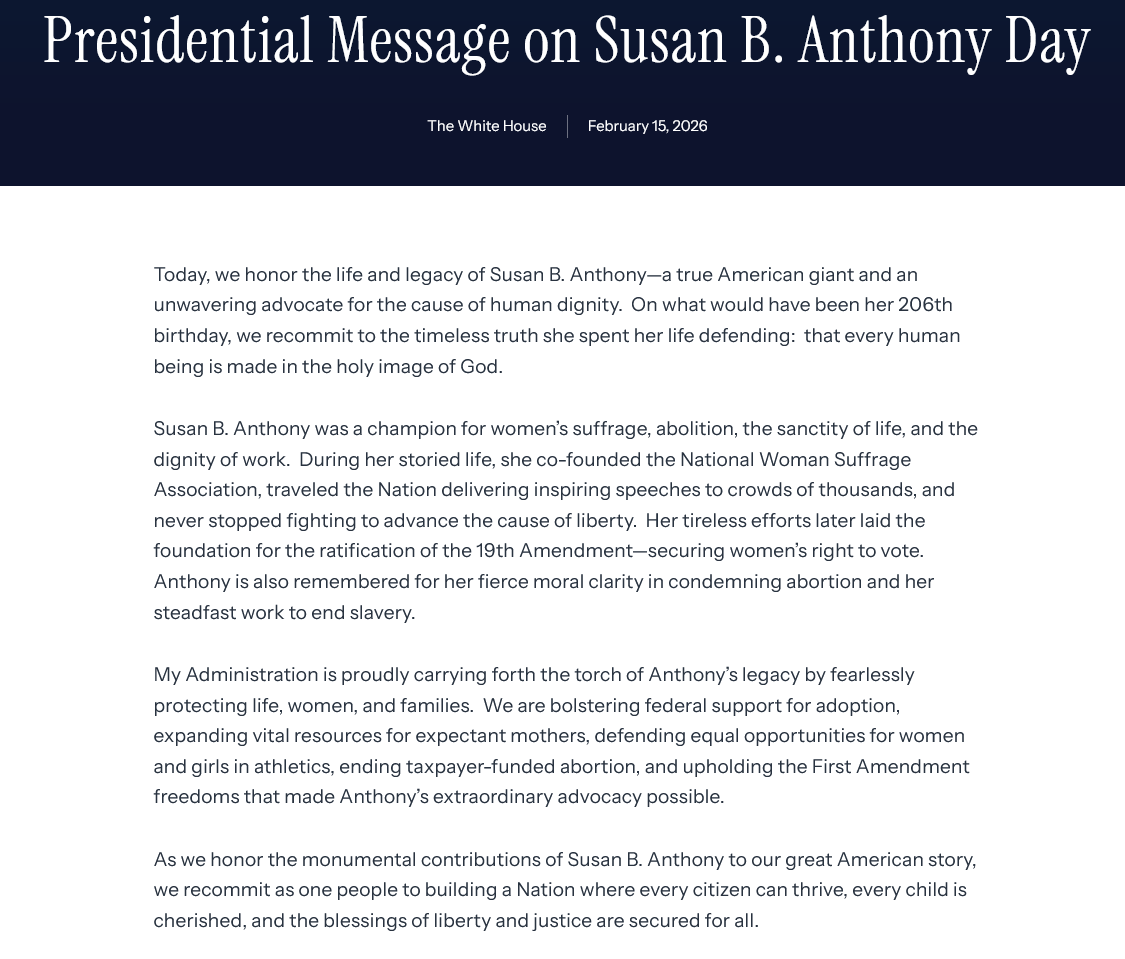 https://www.whitehouse.gov/briefings-statements/2026/02/presidential-message-on-susan-b-anthony-day/