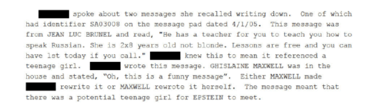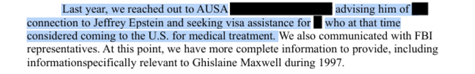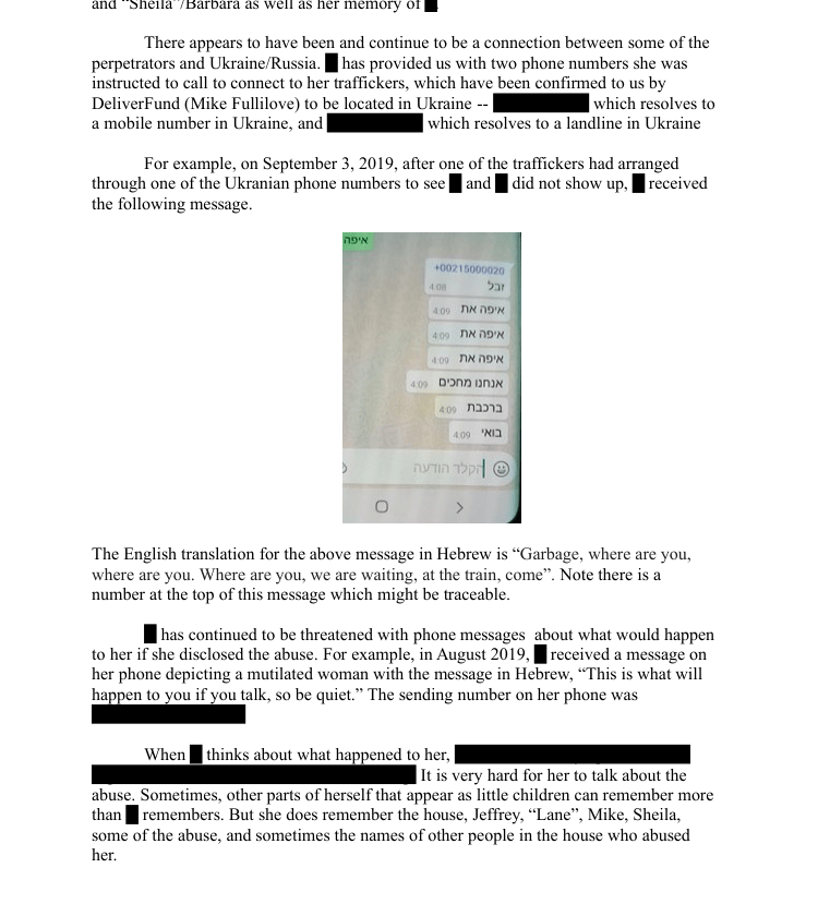 >>528568109Sorry, not 2023, 2020. It's the Leon Black file that was submitted by a lawyer in 2023 where they can't make up if the victim was 6-8 years old, 16, or if she started working for Maxwell at 17.>>528568205I know you don't care, because you have the IQ of a rock.I'll let any Anons who aren't complete fucking retards read the file for themselves instead of posting salacious screenshots.https://www.justice.gov/epstein/files/DataSet%209/EFTA00078198.pdf>Last year, in addition to sending images, [victim] stated that Mike told that her foster mother Sheila was goin to come to Israel and would take [victim] to [victim] a "nice" family did not believe that would be nice at all.>Last year, we reached out to AUSA advising him of [victim? trafficker?]'s connection to Jeffrey Epstein and seeking visa assistance for [victim] who at that time considered coming to the U.S. for medical treatment. This was written in 2020. So "Mike" was sending [] pictures and threats after Epstein was already dead, and the Ukrainians who spoke Hebrew were sending her threats in September of 2019. After Epstein was already Dead.And it was real in her mind.