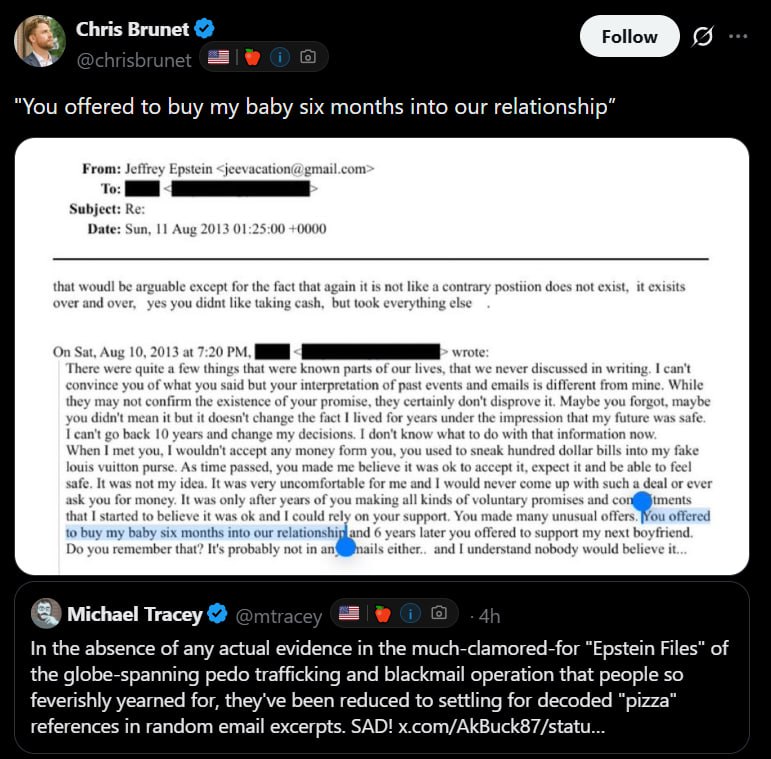 >>528572906>thinks Epstein was innocentWhere did I say that? You sound like this fucking retard.https://www.justice.gov/epstein/files/DataSet%2010/EFTA01720025.pdf>"She is 2x8, not blonde" means it's 2 8 year olds. It clearly, in the light of all the other evidence of Epstein fucking teenagers, must be two eight year olds.I hate you fucking retards who are going to make this go away the way you made the satanic ritual abuse of the 80s go away with your brainless schizophrenic pareidolia confirmation bias >He Played DOMINOES ON CHEESE WITH WALNUT SAUCE! CLEARLY HE WAS FUCKING THE SIX YEAR OLDS!The Kikes are right, you're all cattle and your response convinces me that they'll only fall when they destroy themselves because you fuckers are too stupid to do it.>>528572763>He mentioned cash when she talked about him purchasing her child!What else did she talk about? >>You offered to support my boyfriend>>You told me I could rely on your support>>I wouldn't accept money from you>>You promised to support me!And what did he say? >You can argue that, but the contrary position exists over and over and over.>You didn't like taking cash, but you took everything else.This is a crazy woman crying that she thought she was going to be a princess who didn't have to do anything to get to live happily ever after with her billionaire prince. This is another regretful roastie who is upset that she didn't know what she was getting into when she got into it ten years ago!This is the kind of shit that is going to burn all of your credibility and let Mossad get away with it again.