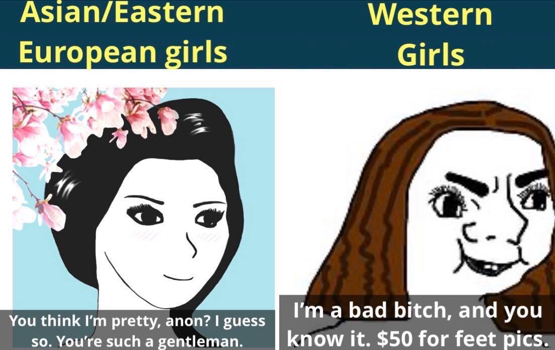 >>528595170I think the overall issue is there is a lack of morality and social shame, so women are not even shaming their peers and because pretty much most men are retarded anyway, they chase after women who act like cam whore, pasted their face full of make up etc regardless.Say in a hypothetical scenario, women shames each other for being a cam whore and men refused to even communicate with women dressed like sluts, over a short preiod of time women would behave with decorum and over time gain morality.In our countries it really is a lack of community, religion and social cohesion. brought on by immigration and outside influences.With the jap women, its their culture too, kind of a similar scenario, just not as intense.Though for me, their behaviour is rather disgusting. Acting like children.Still not every woman in the world is like this, not every western woman is a cam whore and not every jap woman acts like a child. Just if you want to find the better women you probably have to delve deeper into parts of society where women like that would not hang out.