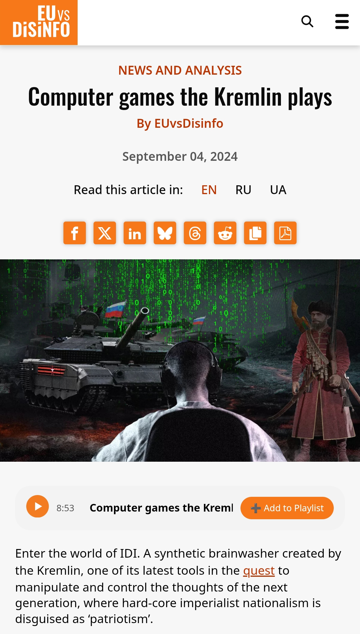 >>528592834Already covered in another article.https://euvsdisinfo.eu/computer-games-the-kremlin-plays/>‘Smuta’: a virtual Potemkin village and an example of ‘patriotic’ corruption>‘Sparta’ – another game about the Wagner PMC presence in Africa>‘Front Edge’: a direct military clash between Russia and the US in Eastern Europe