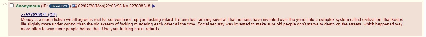 >>528610420>Probably related to the cost to build such a structure these days. There’s nothing stopping you from having a two to 3 family home built and going in on the mortgage with the other parties involved in the project. It’s not at all that uncommon that families convert useable space over to studio apartments for other family members. There are plenty of multi- generational properties out there, you just have to be willing to put your name on a mortgage with other family members. That or have parents willing to accept the additional costs of buying more of a home than they already need.That actually goes back to a post I made earlier in the thread. See picrel attached which basically states:>money is basically a made up fiction that we all agree to for convenience. It's basically one of several tools that humans have invented over the years into a complex system called civilization. This kept things more under control than the old system of fighting and killing each other all the timeThat fiction is no longer serving it's function? A Smith & Wesson beats four aces. Eventually, people will just start taking shit. Do I go through all that shit with the bank or do we go Tren de Aragua and just take it?