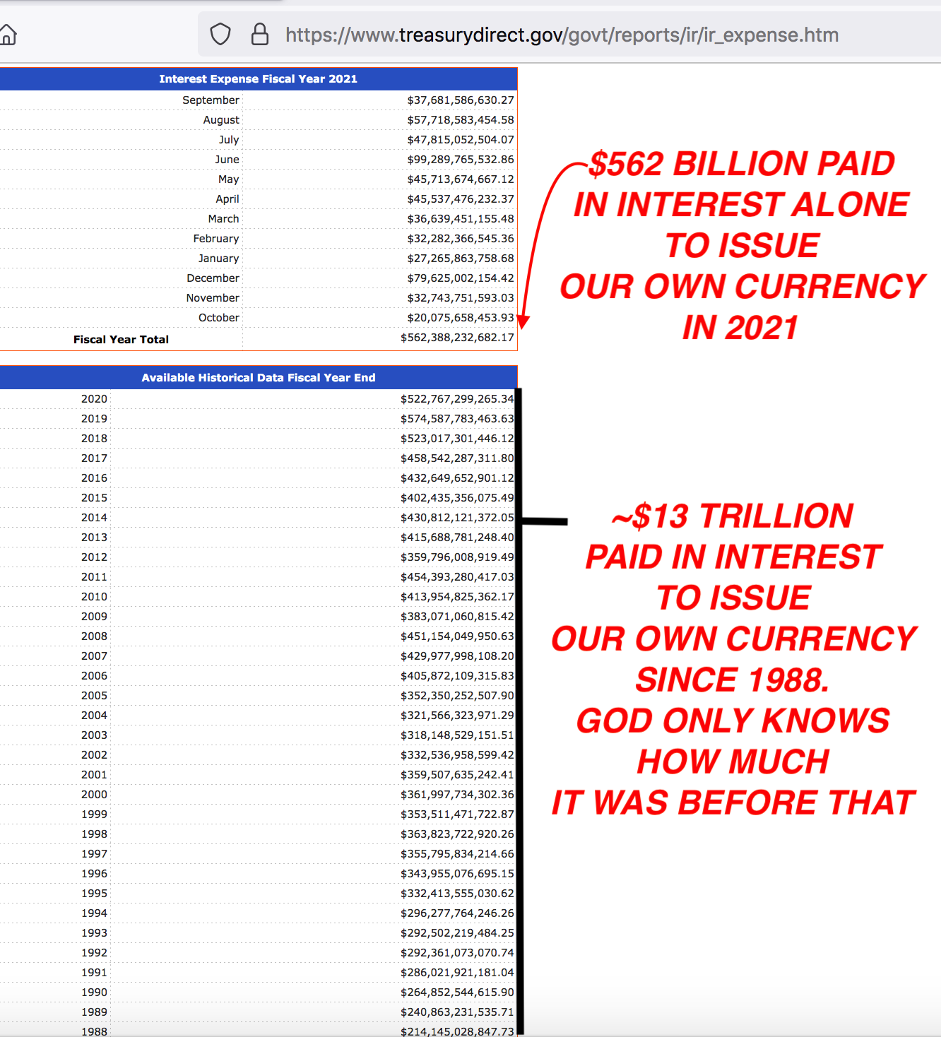 >>528617846boomers over value themsleves (their skills) and their possessionssuggesting mere pittances for others and paying themselves exorbitant pensions and lavish retirementsthey have fucking sold out the fucking countryUS taxpayers paid the IRS $562 Billion in interest alone in fiscal year 2021 to borrow the Federal Reserve’s debt-based currency out of thin air in the form of bond debt$562 billion($562,000 million)Pic relatedHow it is:>US government needs currency >US Treasury prints up some bonds>NY Federal Reserve creates Federal Reserve Notes out of thin air and its primary dealers then buy said bonds from US Government>US government now has new currency created out of thin air by Fed banks>Now, US taxpayers owe interest (and principal) on said US bonds, as well as paying a fee AND DIVIDENDS to the NYFed’s shareholders, the primary dealers (the big banks), this is the ‘Public Issues’ portion of the US Public Debt How it should be:>Congress makes annual budget>Tax revenues are collected and any budget shortfall (deficit) is then new debt-free US Notes issued by the US Treasury itself, no bonds needed, no US Public Debt to issue our own currencyAre Americans ever going to realize this fraud?>when a generation sells the futures of their country and their offspring for unsustainable and lavish wealth and their offspring are too stupid to realize it