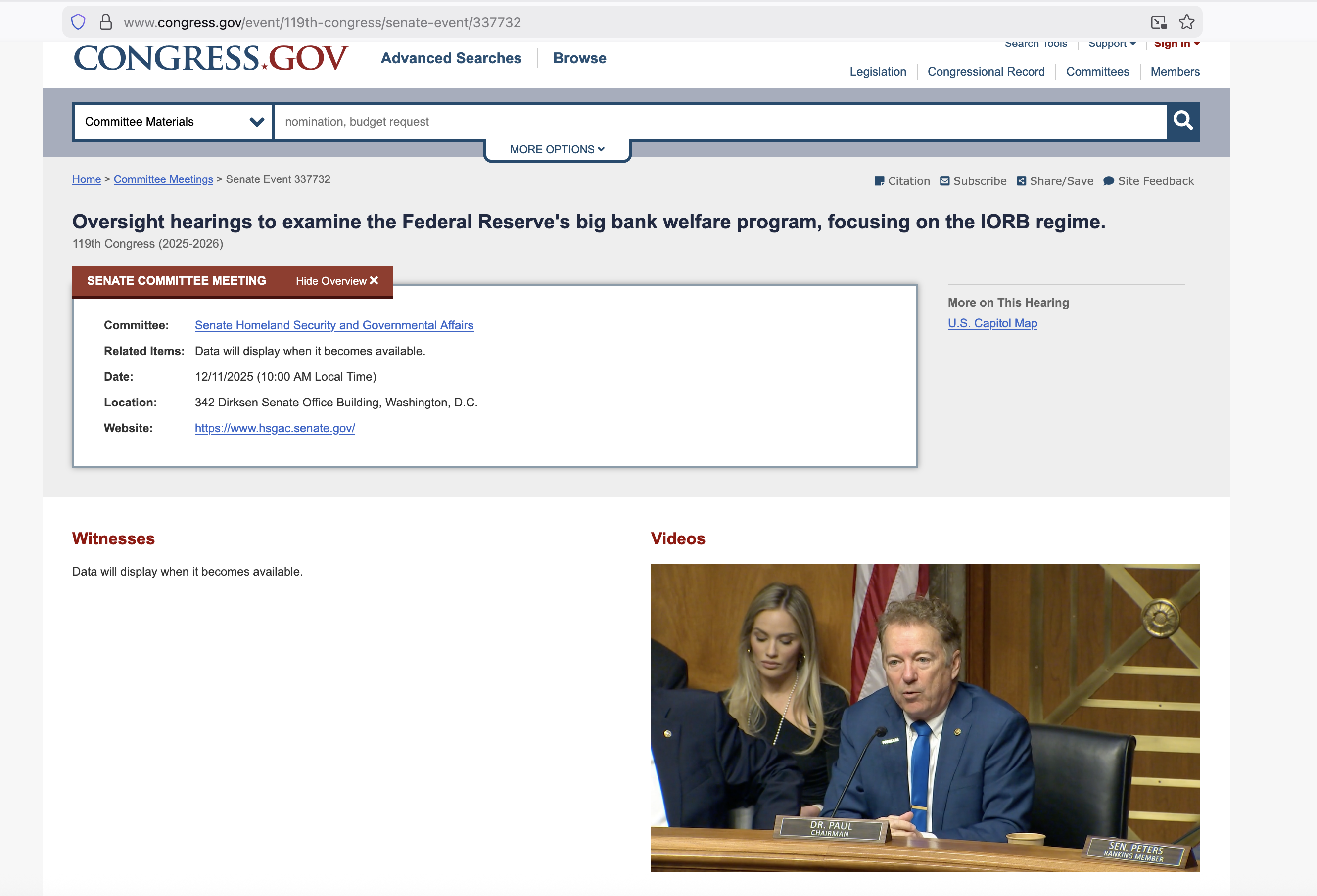 Rand Paul Abolish IORB hearing Dec 11, 2025Oversight hearing to examine the Federal Reserve's big bank welfare program, focusing on the IORB regime.US Homeland Security and Government Affairs Committeehttps://www.congress.gov/event/119th-congress/senate-event/337732And a thread on the Rand Paul ‘Abolish IORB’ hearing:https://archive.4plebs.org/pol/thread/524024672/#q524024672