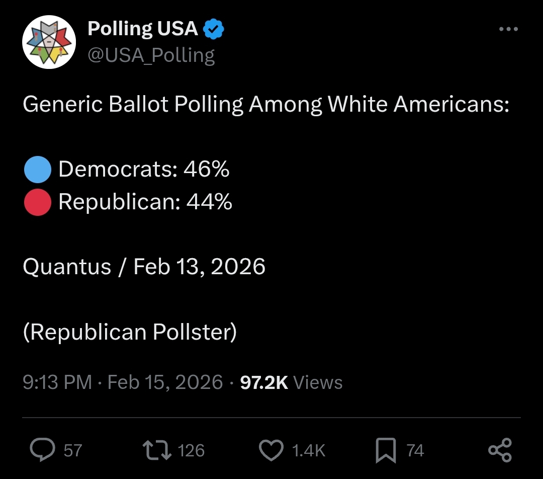>>528606489>generic poll>dems only at +2That's horrible for them. You realize that's counting places like California and NYC right? Even if it's just among whites that's not good for dems.