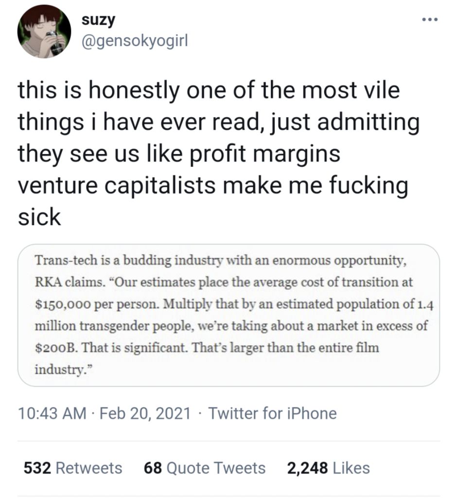 >>528611815>Yes, the transgender movement is a cynical industry meant to get mentally-vulnerable people addicted to chasing a unicorn, but who cares?>BTW puberty blockers for kids, NOW!