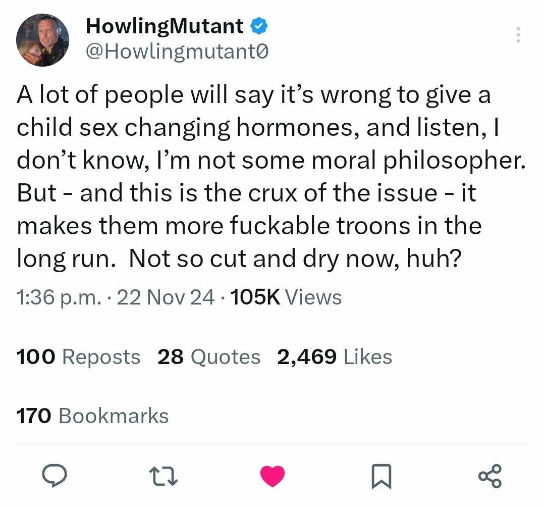 >>528610412It's equivalent to castrating little boys for a choir or a eunuch. Transing children even with a good looking troon manifests a destructive civilization by undermining and perverting a self-sustaining and decently performing society. It's not too damaging if adults transitioned, but the tranny will naturally move to groom children into the troon body modifications and rituals. They'll push a glittered idealization of transitioning, body altering drugs and surgeries, self-sterilization and humiliation, worse baseline sexual perversions, and political activism to further the tranny's influence within society to force normal people to participate in their delusional rituals like pronouns and other such social decorum backed by authority.Suffer not the tranny to live.