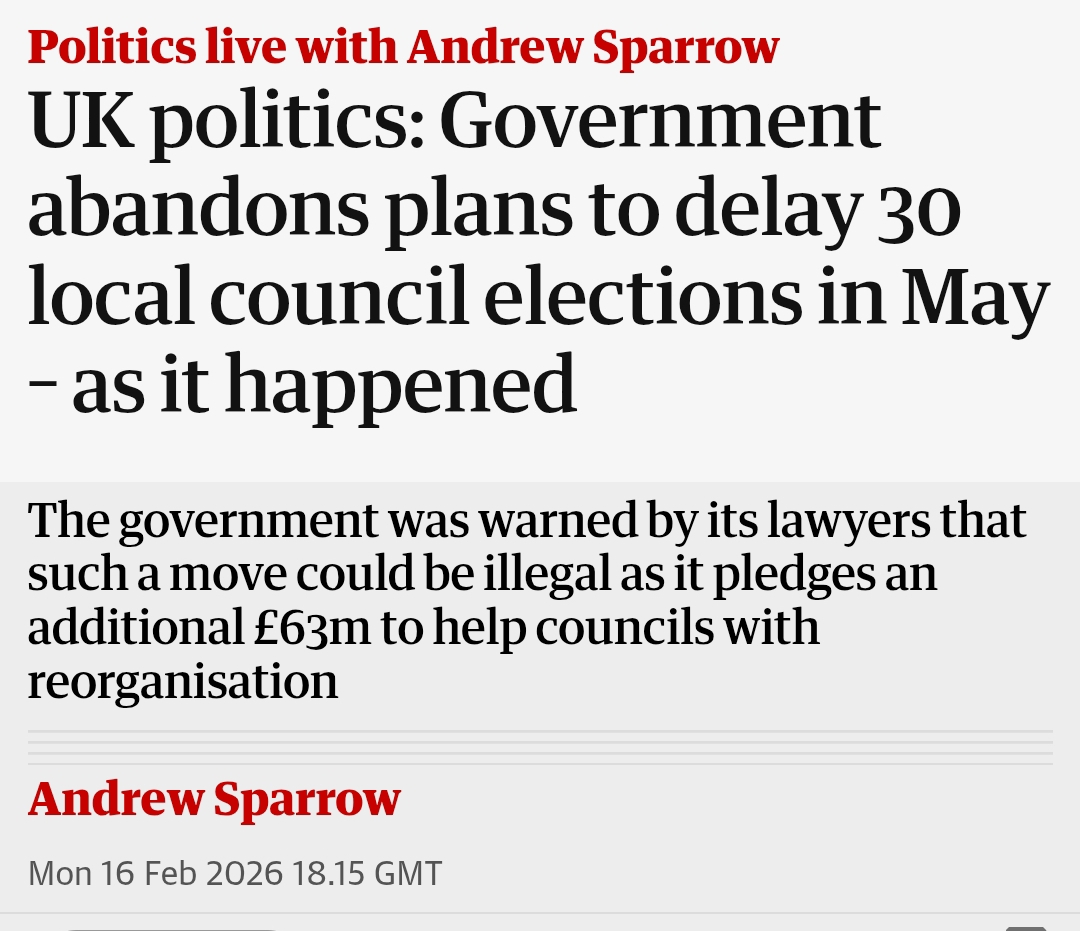>The government has abandoned plans to delay 30 council elections in England, following advice this could be unlawful.>Local Government Secretary Steve Reed had approved delays for the ballots until 2027, arguing some councils were worried about the cost of running elections for authorities which are due to be abolished in a major reorganisation of local government.>Reform UK had launched a legal challenge against the plans to delay May's elections, which was due to be heard in the High Court on Thursday.>The move was welcomed by opposition parties, who had branded the delays undemocratic.lmao lmao lmao